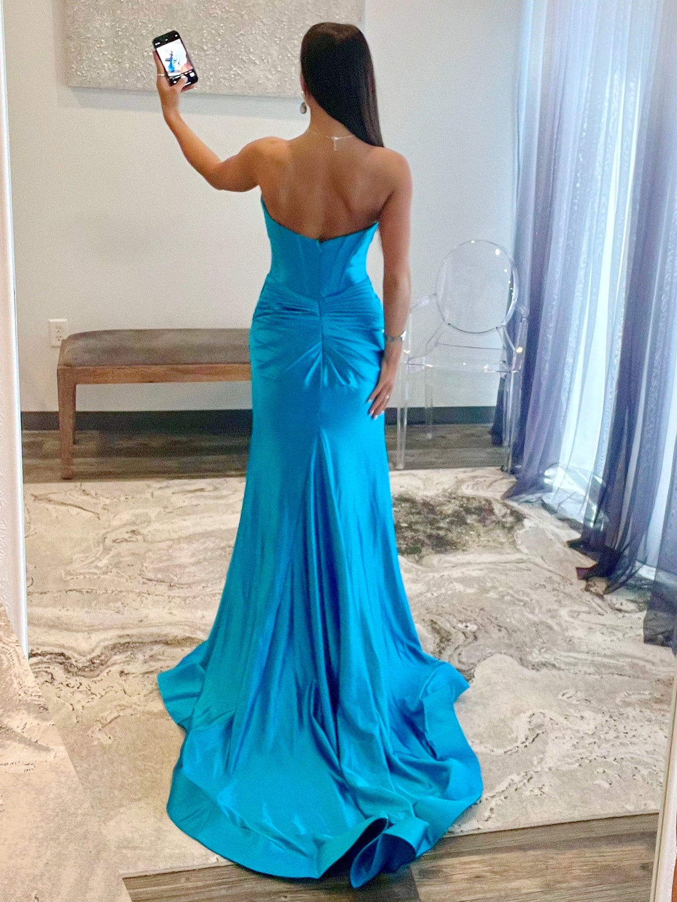 This stretch satin prom gown features cut front on the bodice. The strapless maxi dress has a sweetheart neckline and pleated hem. This mermaid formal dress is ideal for party, evening or festivals.