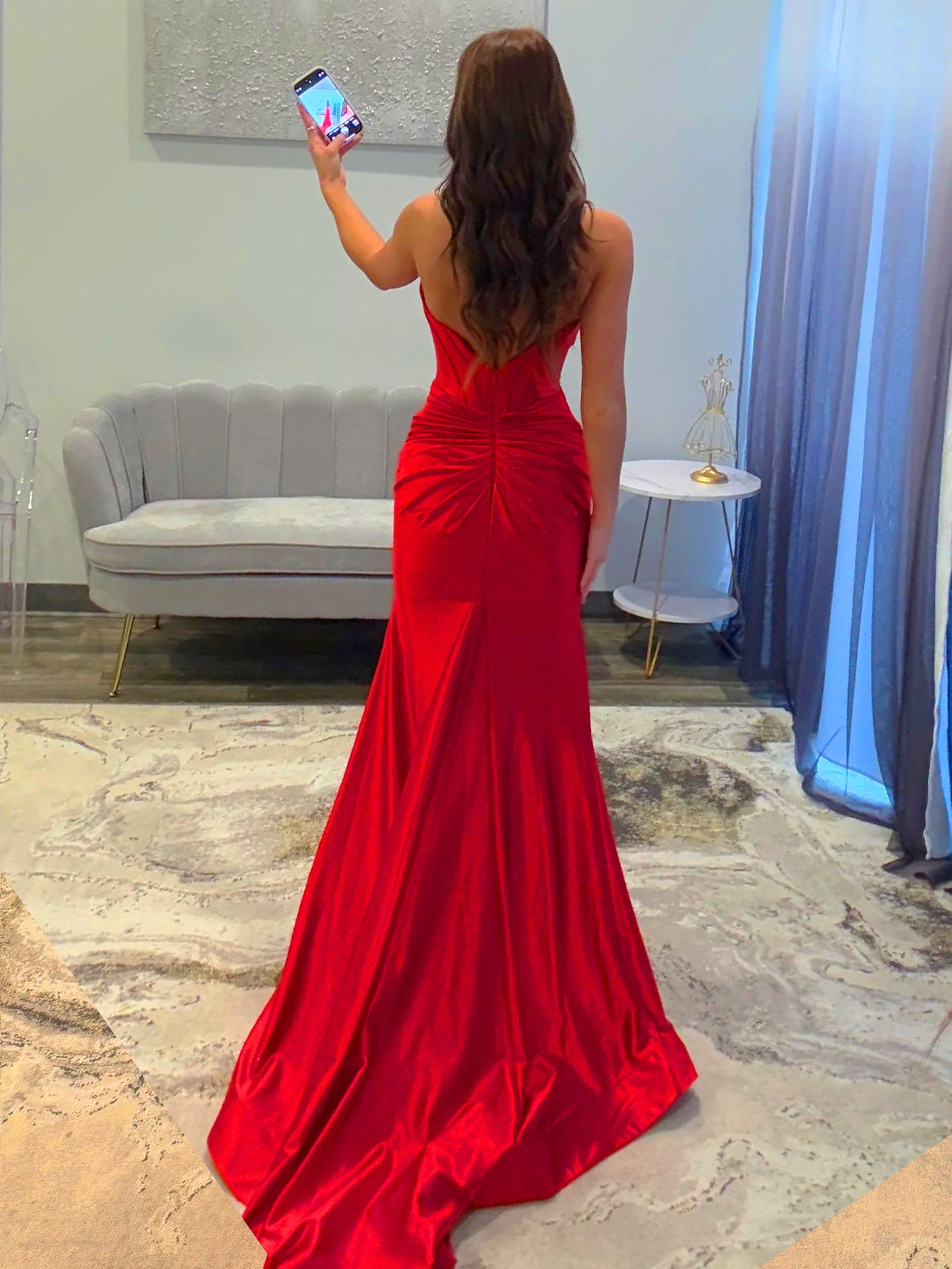Cut Front Pleated Mermaid Prom Dress With Split - Red