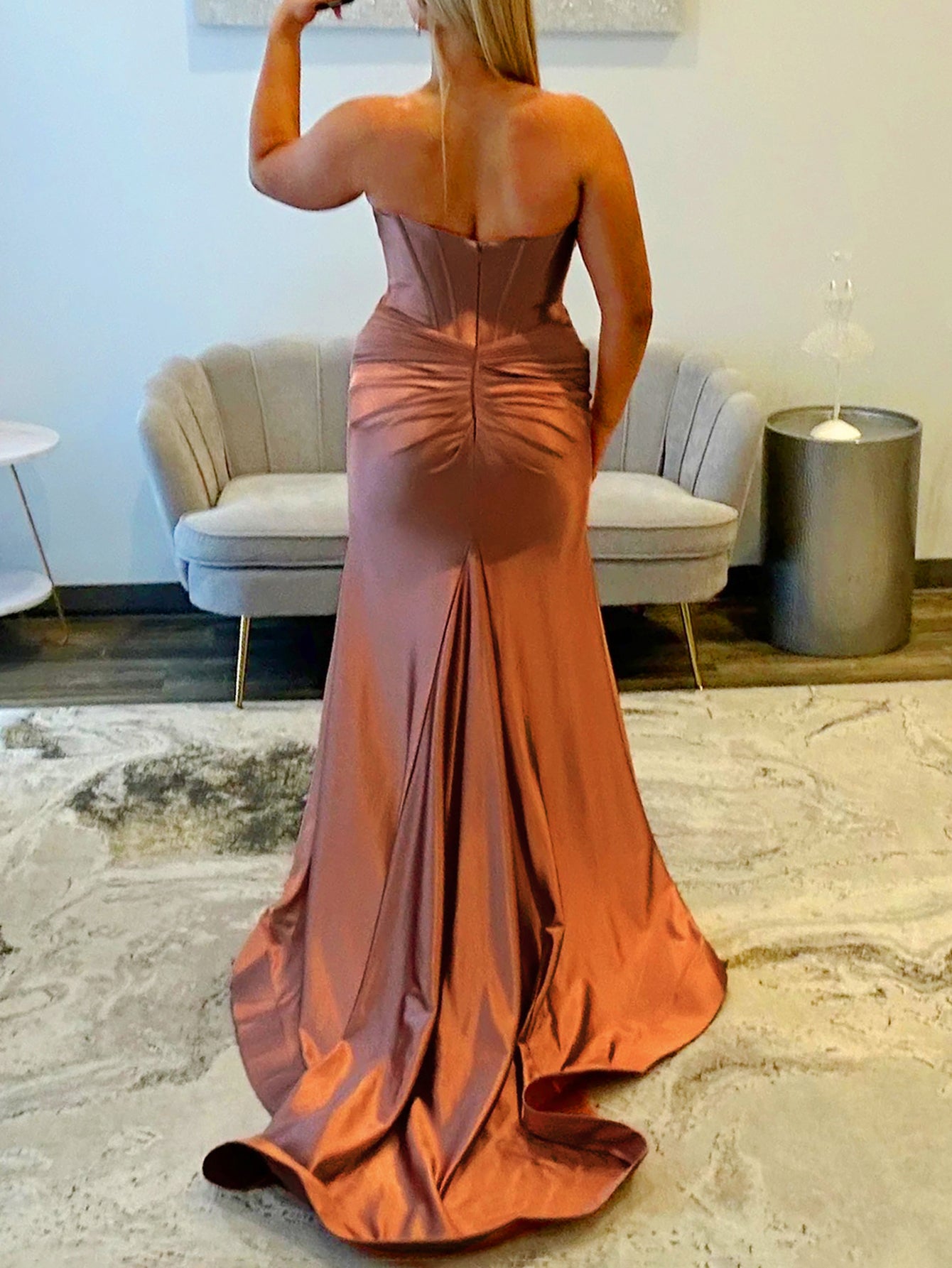 Details: Backless, Cut Front, Split, Boned, Pleated