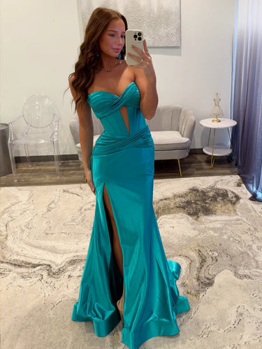 Cut Front Pleated Mermaid Prom Dress With Split - Turquoise