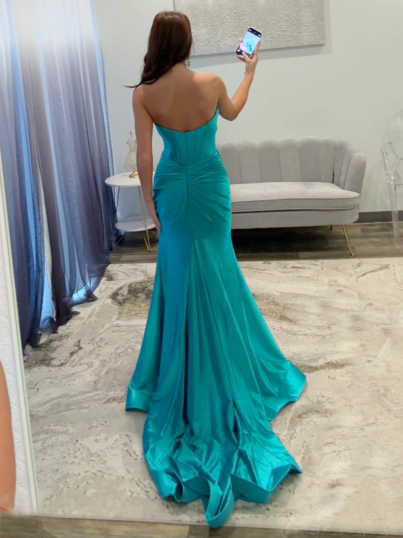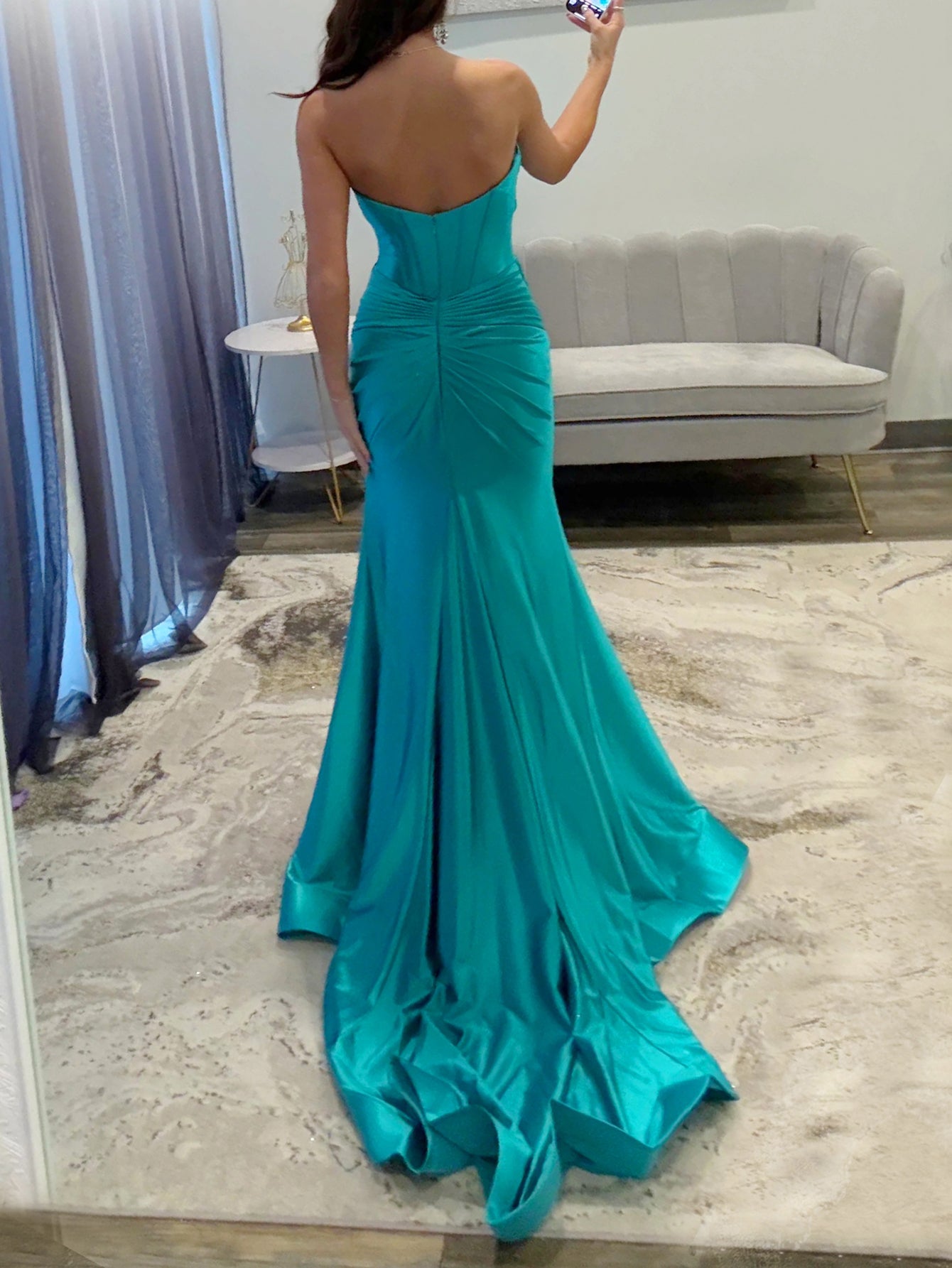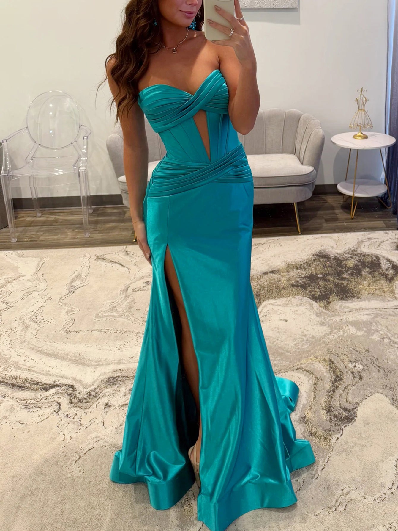 This stretch satin prom gown features cut front on the bodice. The strapless maxi dress has a sweetheart neckline and pleated hem. This mermaid formal dress is ideal for party, evening or festivals.