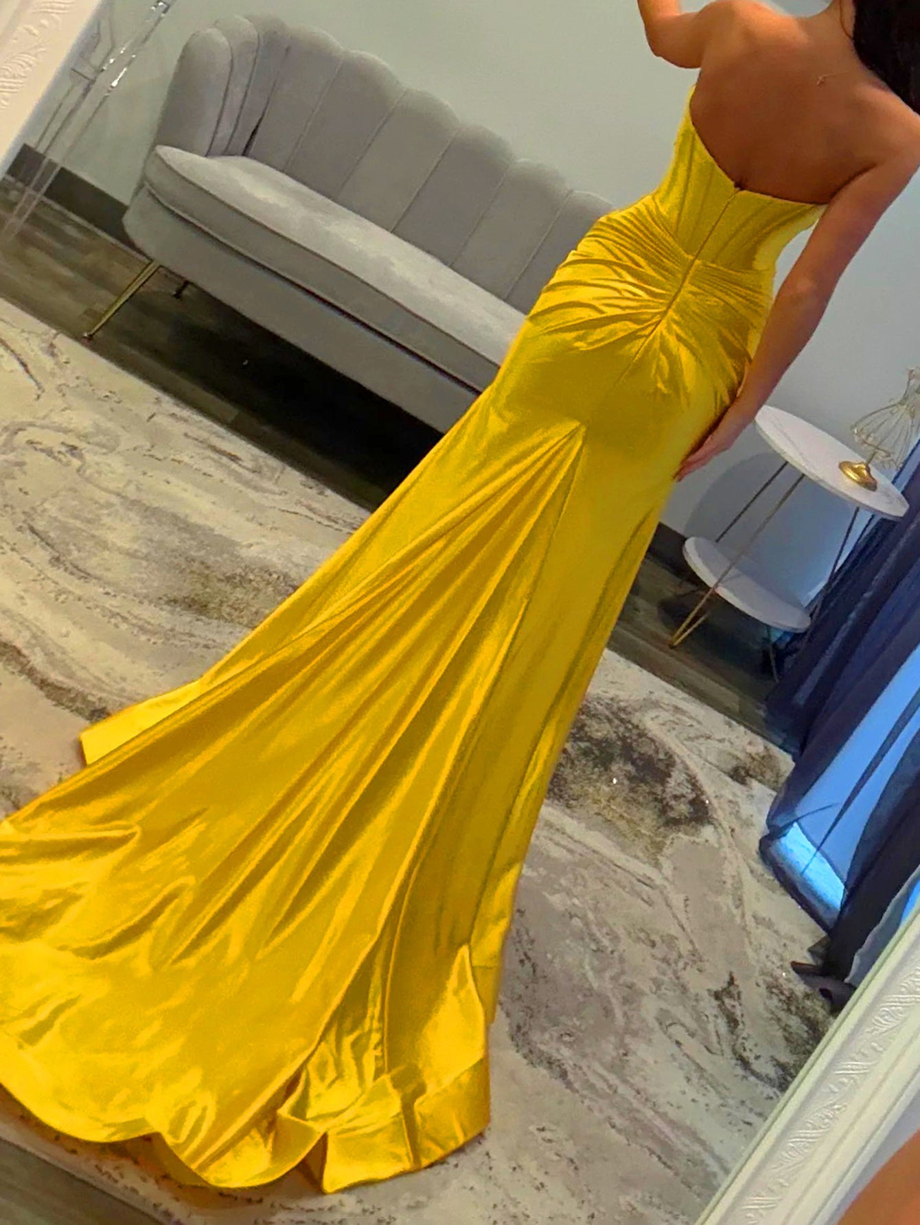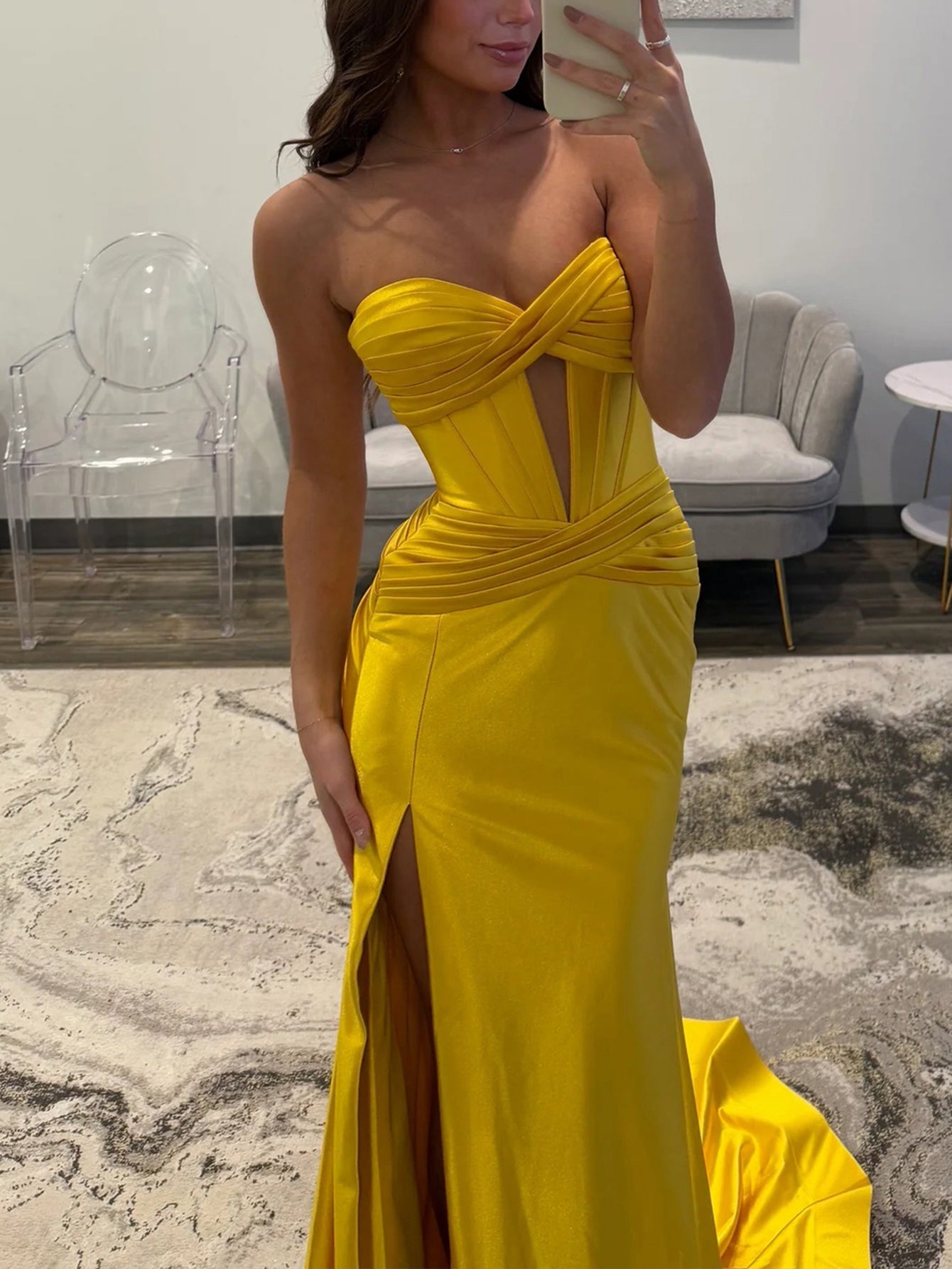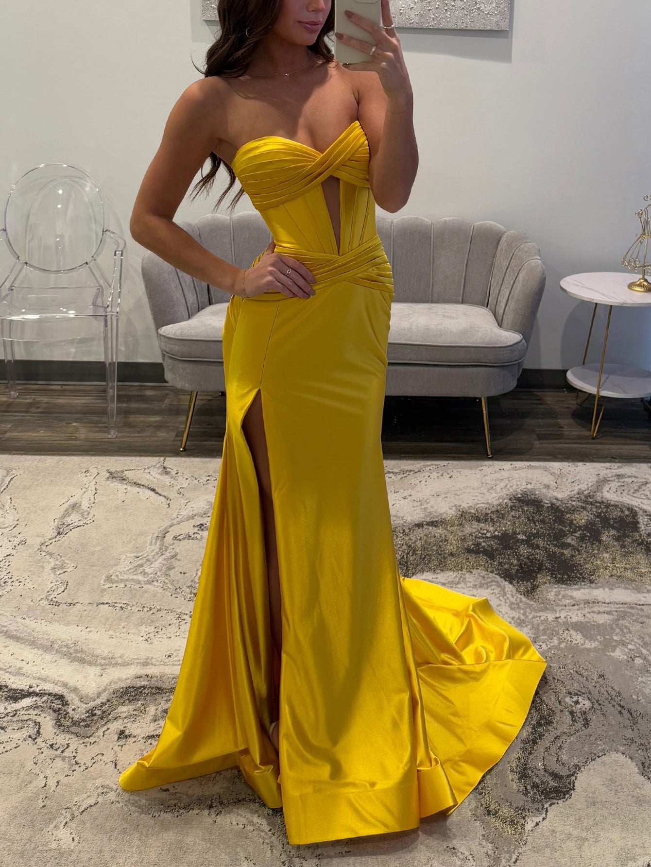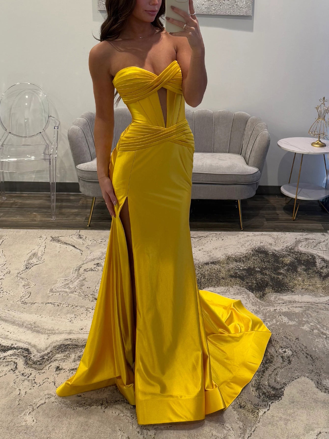 Cut Front Pleated Mermaid Prom Dress With Split - Yellow