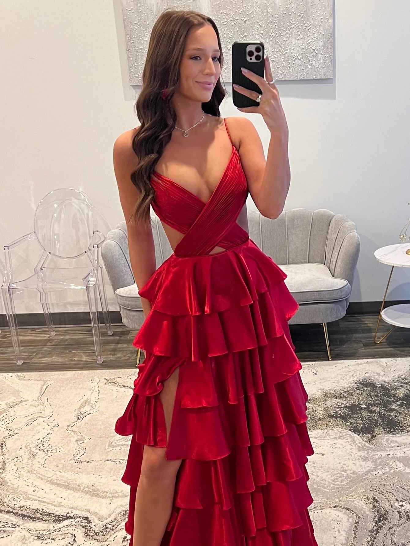 This satin prom gown features cut side on the bodice. The strapless maxi dress has a v-neckline and ruffle hem. This long formal dress is ideal for party, evening or festivals.