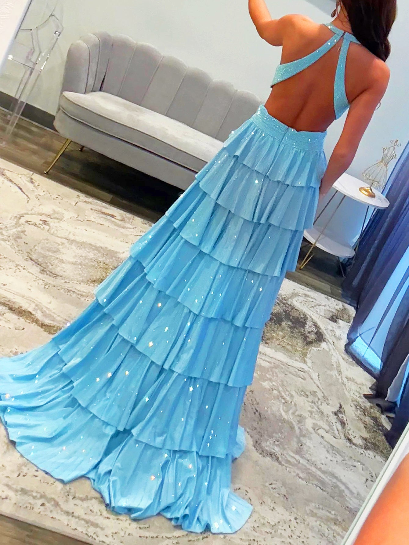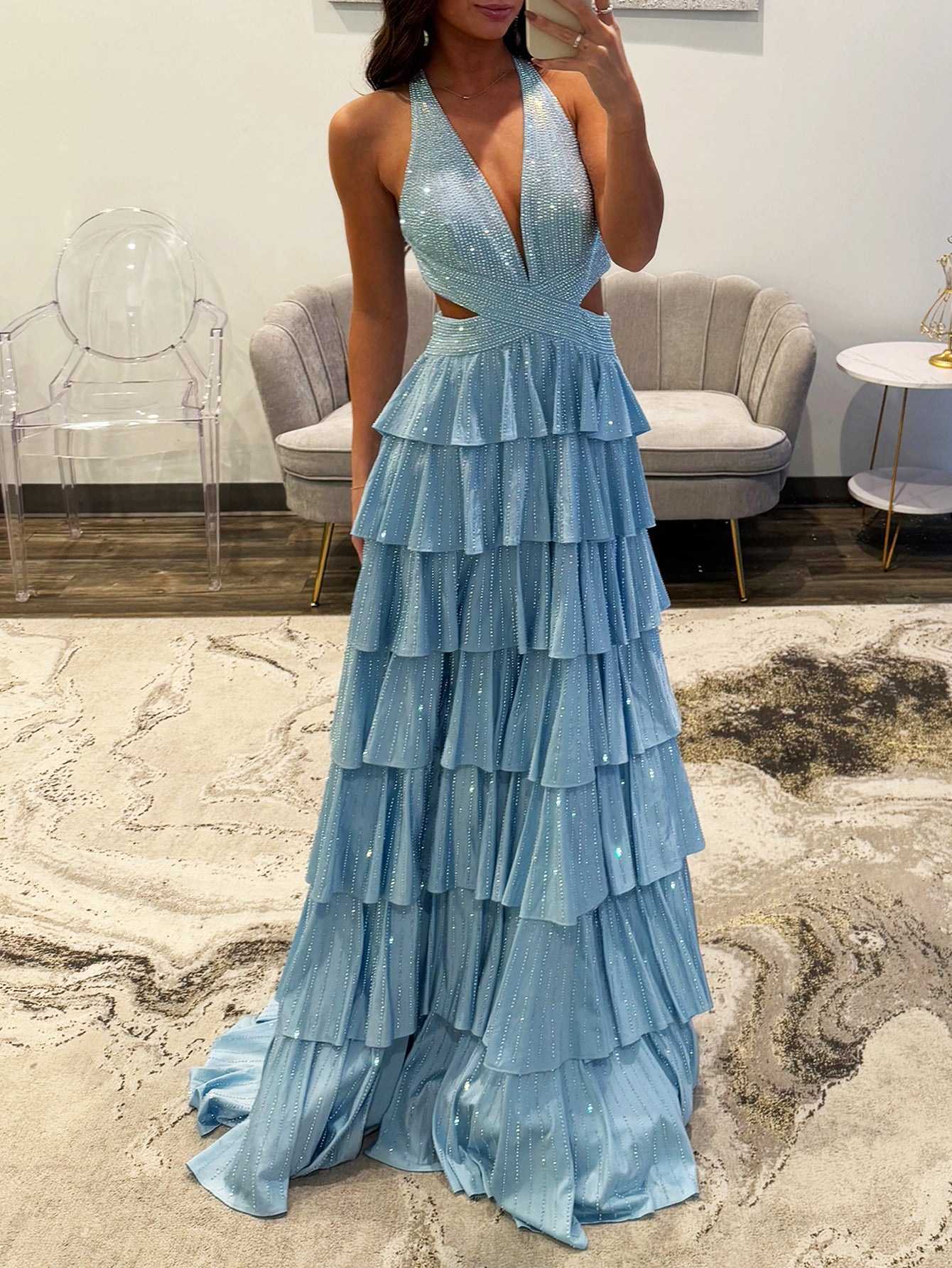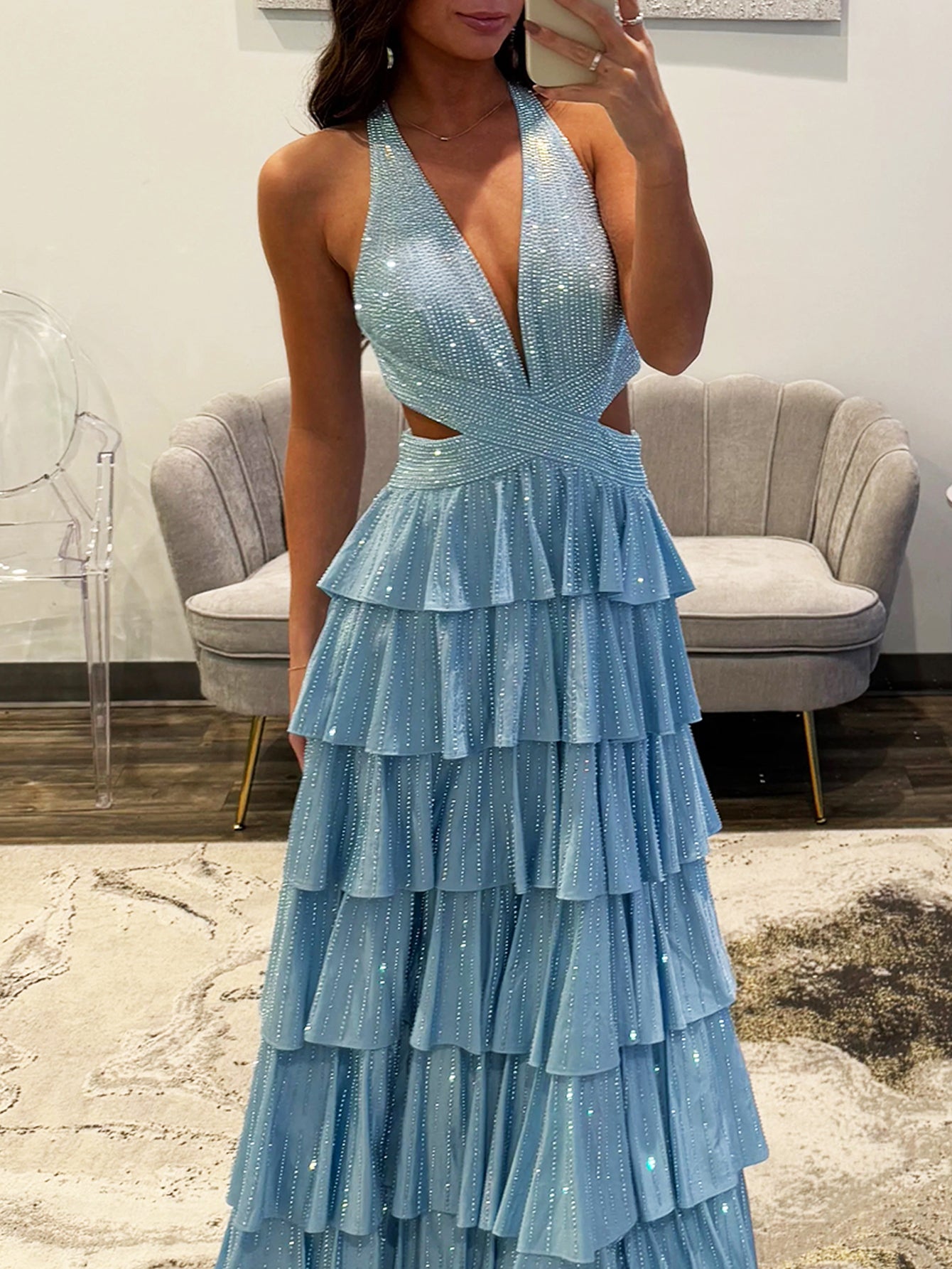 Cut Waist Halter Crystal Ruffle Ball Gown Prom Dress - Sky Blue