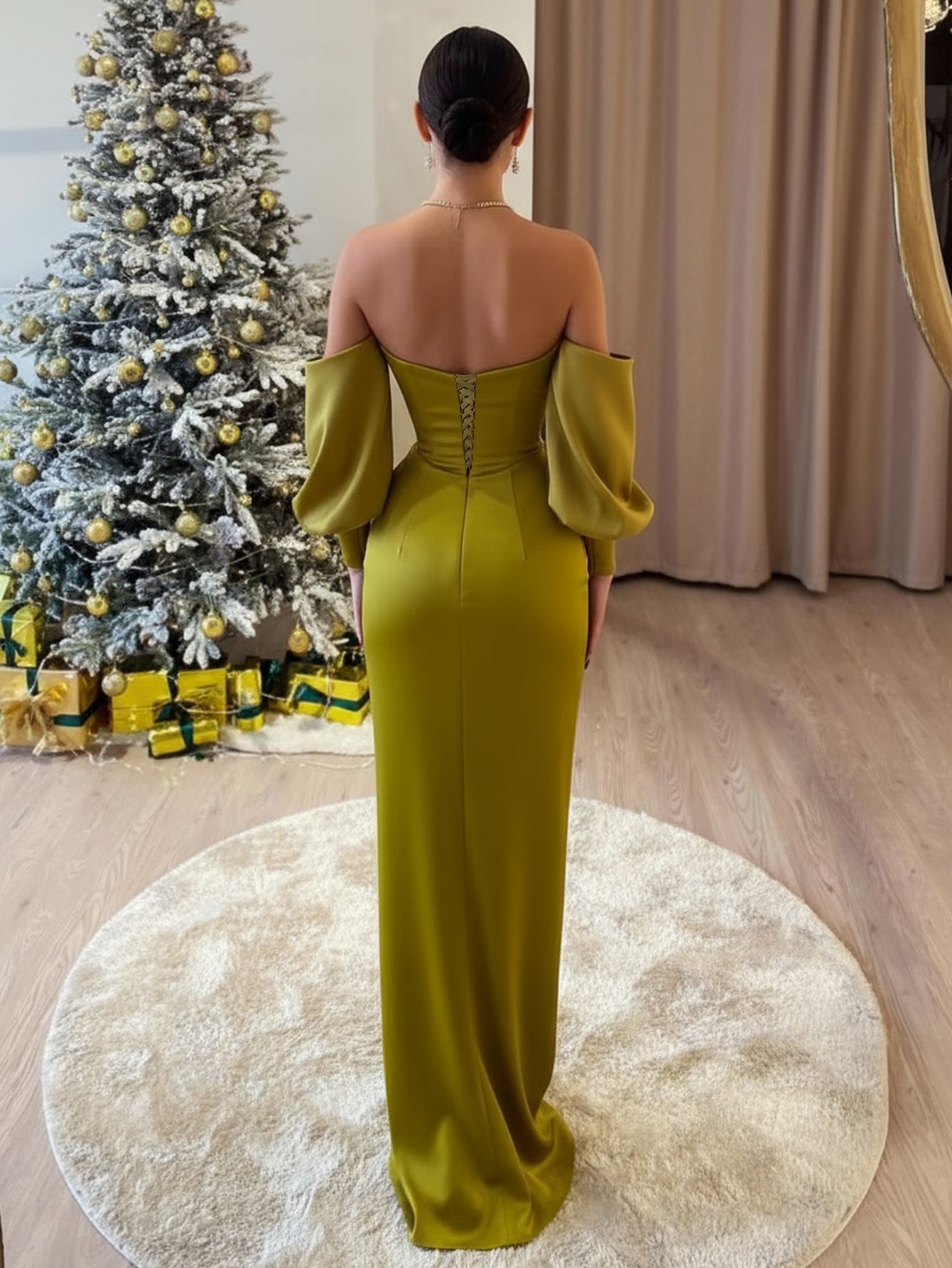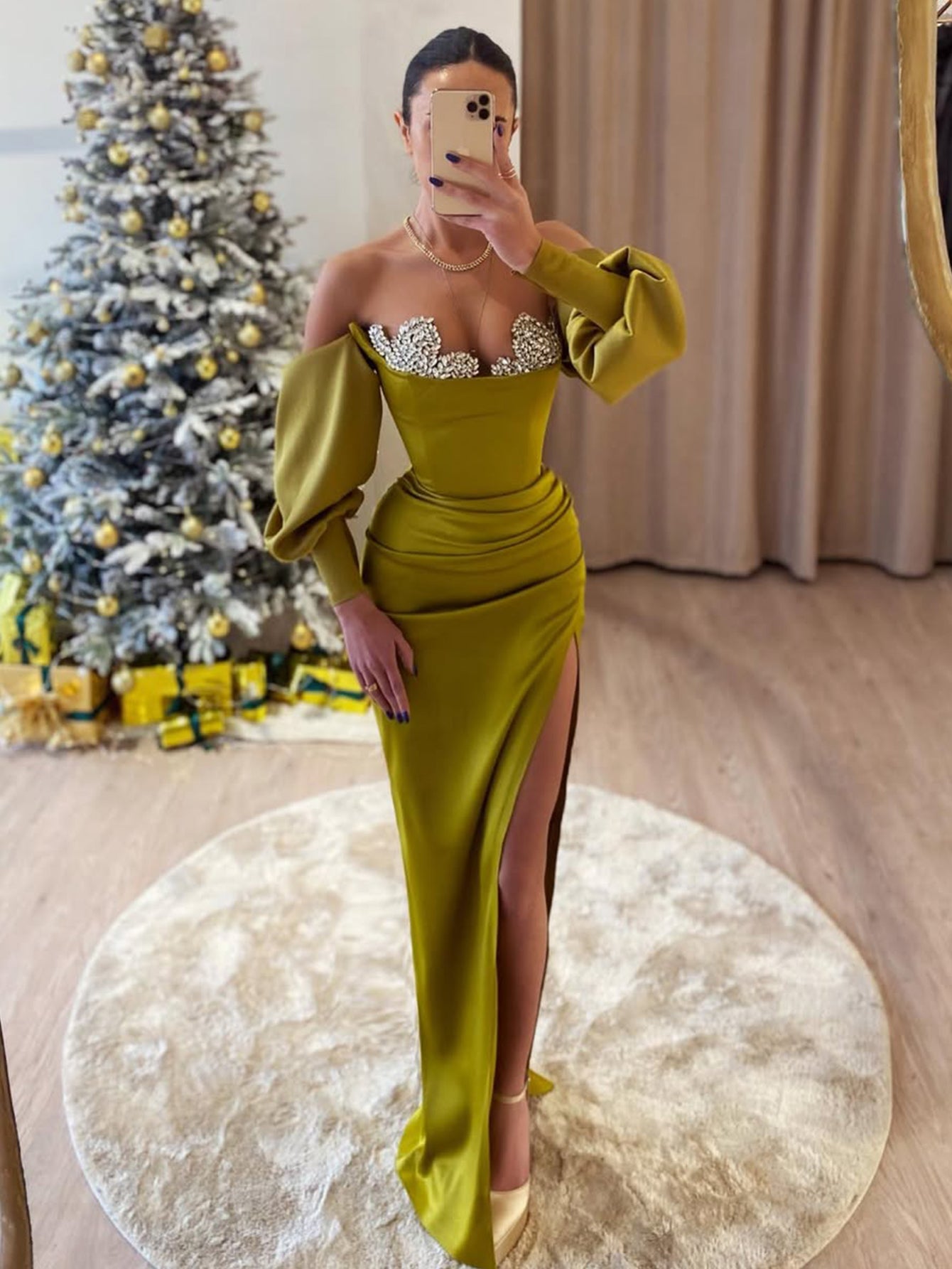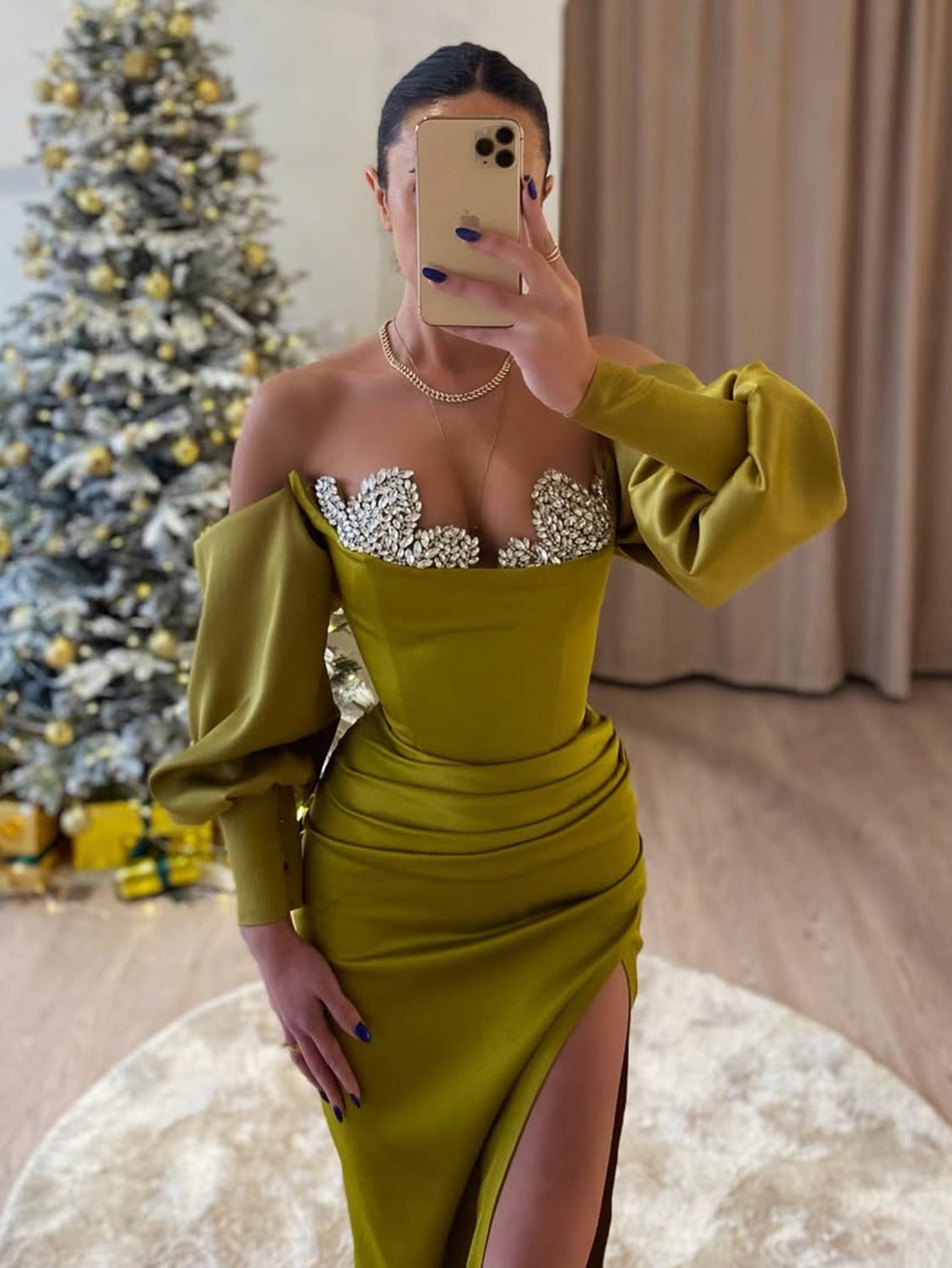 Detachable Sleeves Crystal Long Prom Dress - Olive Green