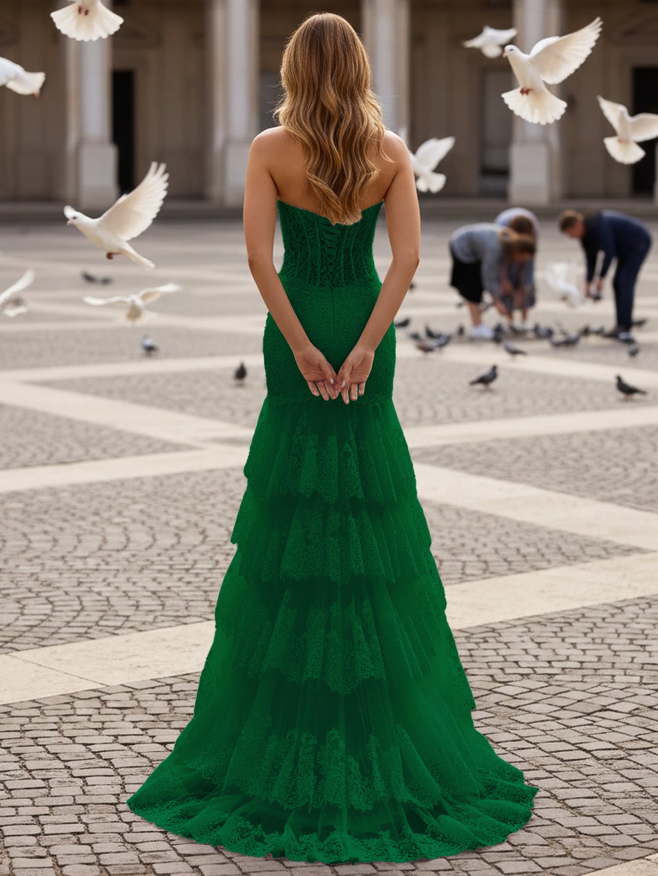 This tulle prom gown features embroidery sheer on the illusion bodice. The strapless dress has a scoop neckline and ruffled hem. Worldprom mermaid prom dresses are ideal for party, evening or festivals.