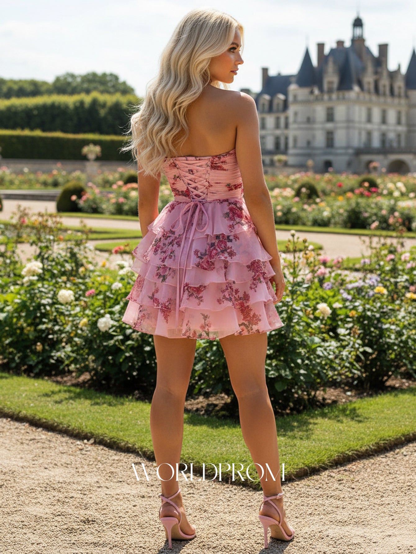 Floral Printing Layered Mini Prom Dress With Hand Made Flower - Pink Floral