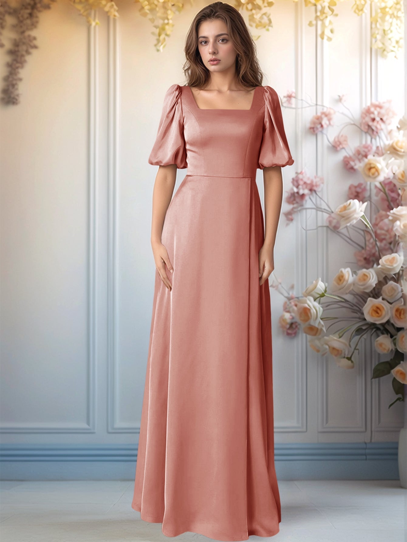 Half Sleeves Square A-Line long Bridesmaid Dress - Blush Pink
