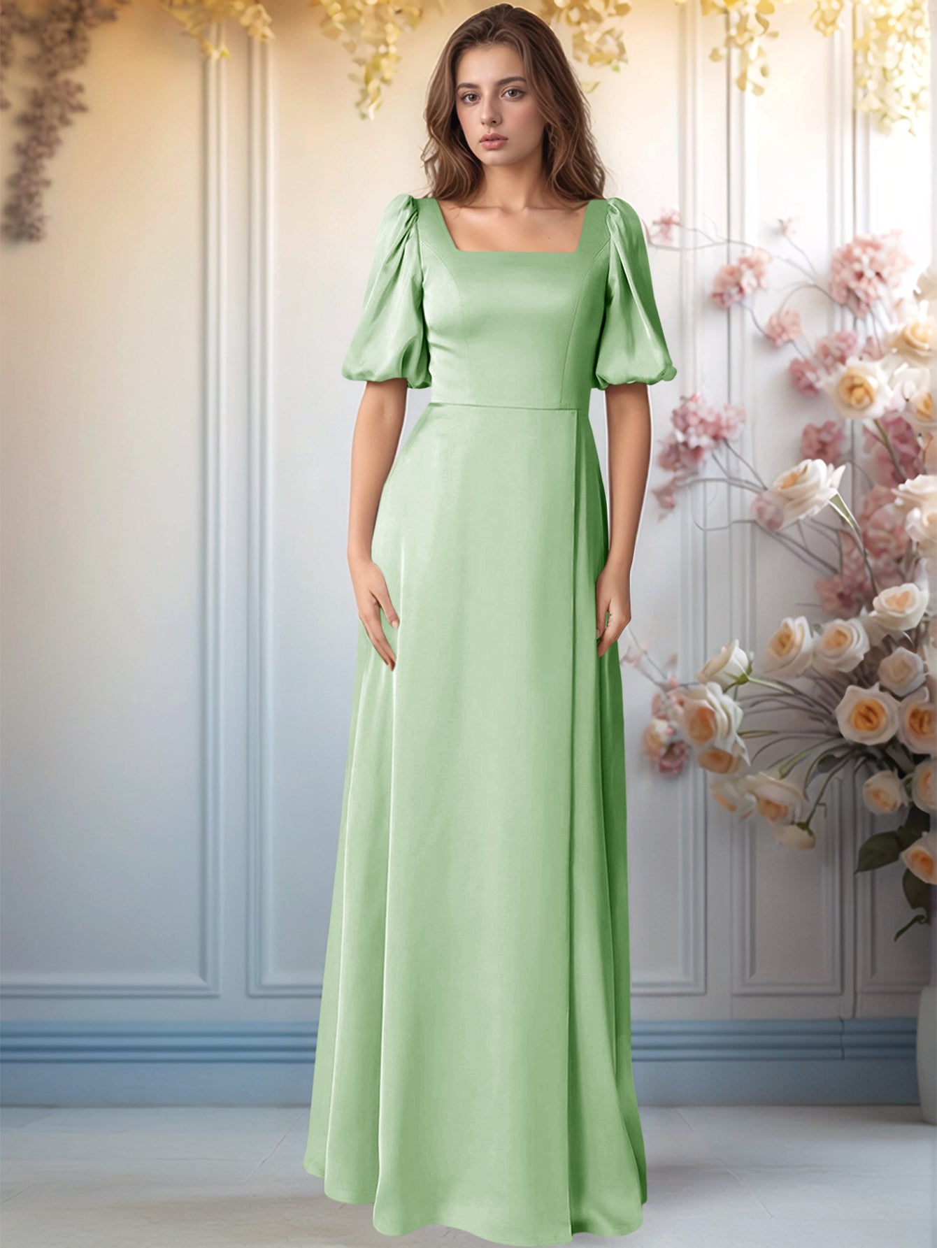 Half Sleeves Square A-Line long Bridesmaid Dress - Mint Green