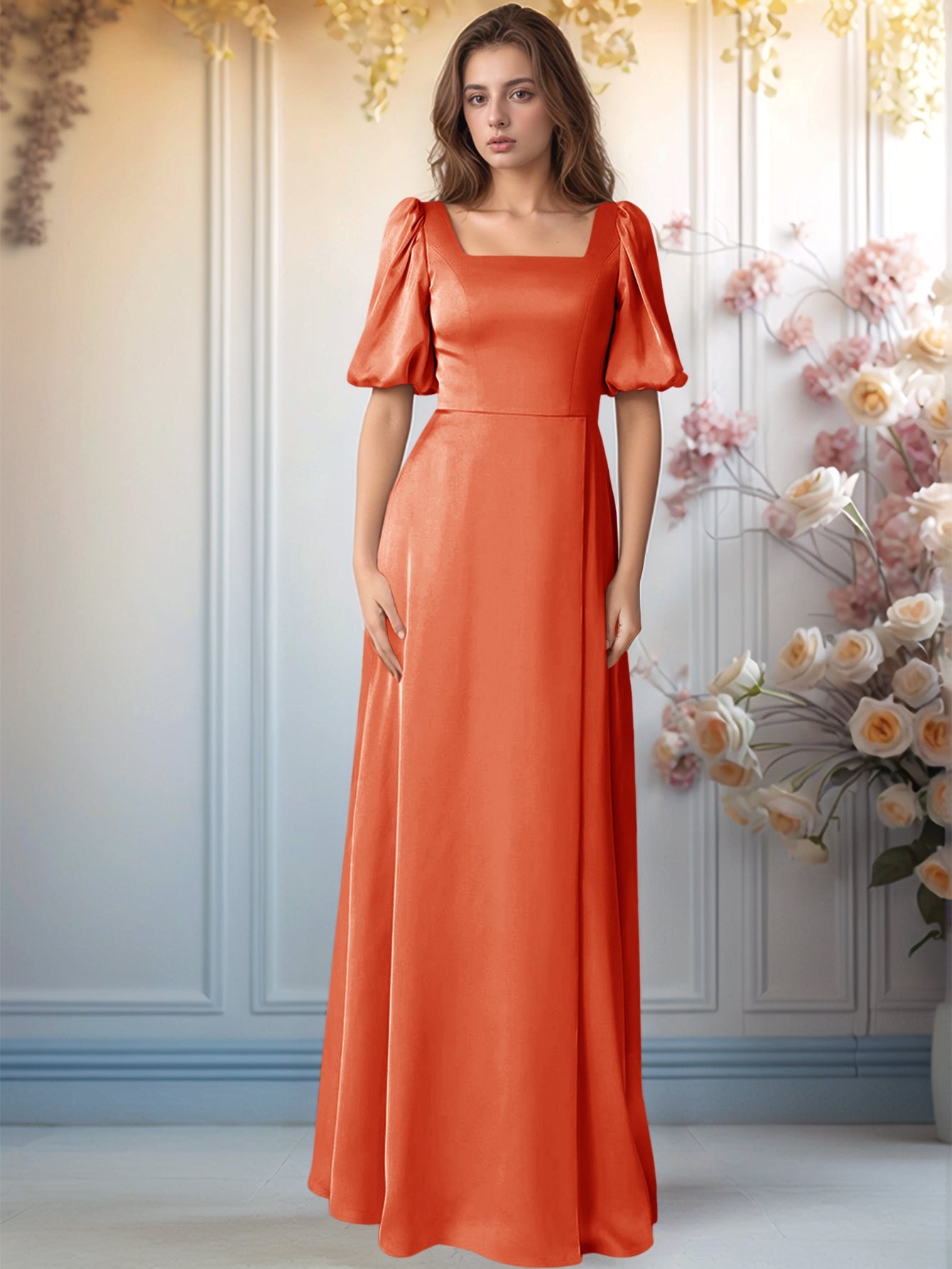 Half Sleeves Square A-Line long Bridesmaid Dress - Orange