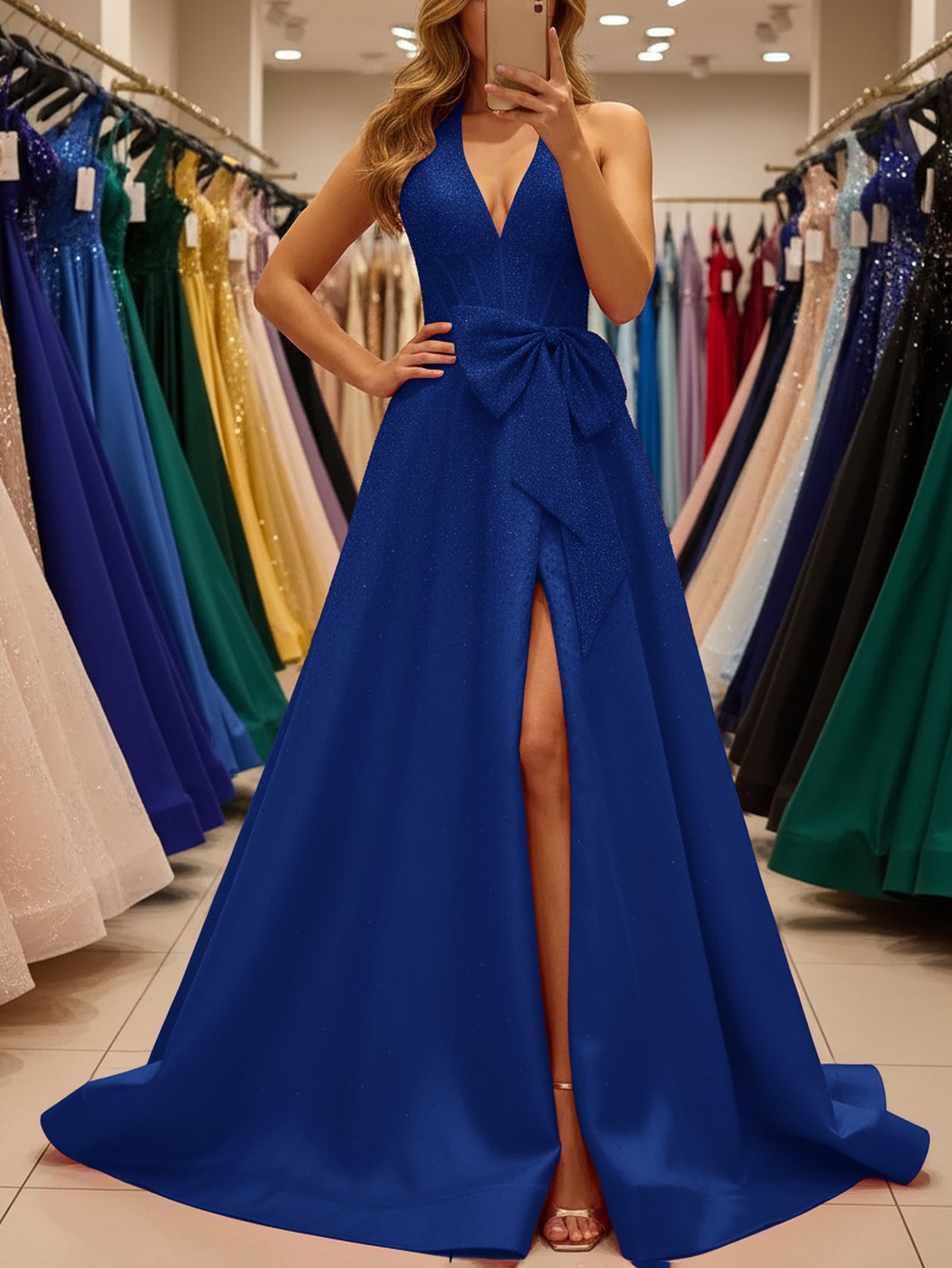 This satin prom gown features sparkly beading with big bow on the bodice. The halter maxi dress has a V-neckline and split hem. Worldprom ball gown prom dresses are ideal for party, evening or festivals.