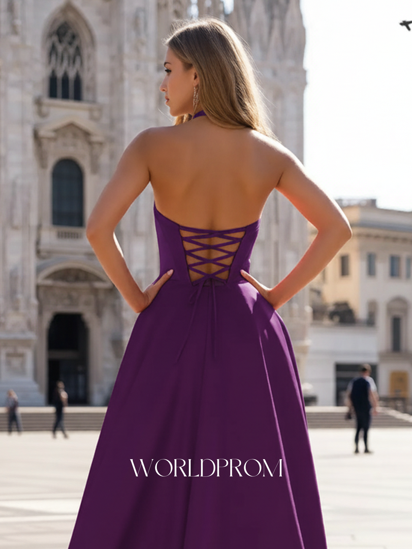 This satin prom gown features ruched bust with pockets on the bodice. The halter backless dress has a V-neckline and pleated split hem. Worldprom a-line prom dresses are ideal for party, evening or festivals.