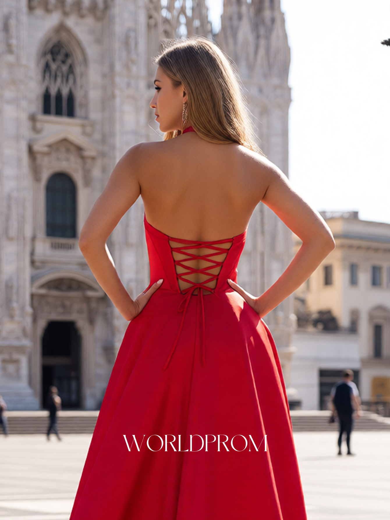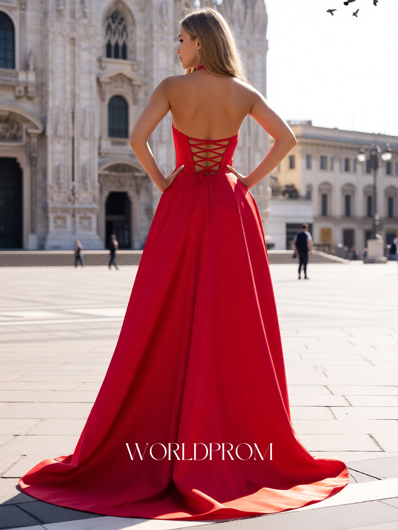 This satin prom gown features ruched bust with pockets on the bodice. The halter backless dress has a V-neckline and pleated split hem. Worldprom a-line prom dresses are ideal for party, evening or festivals.