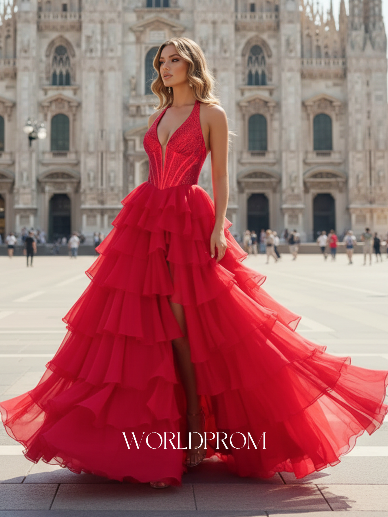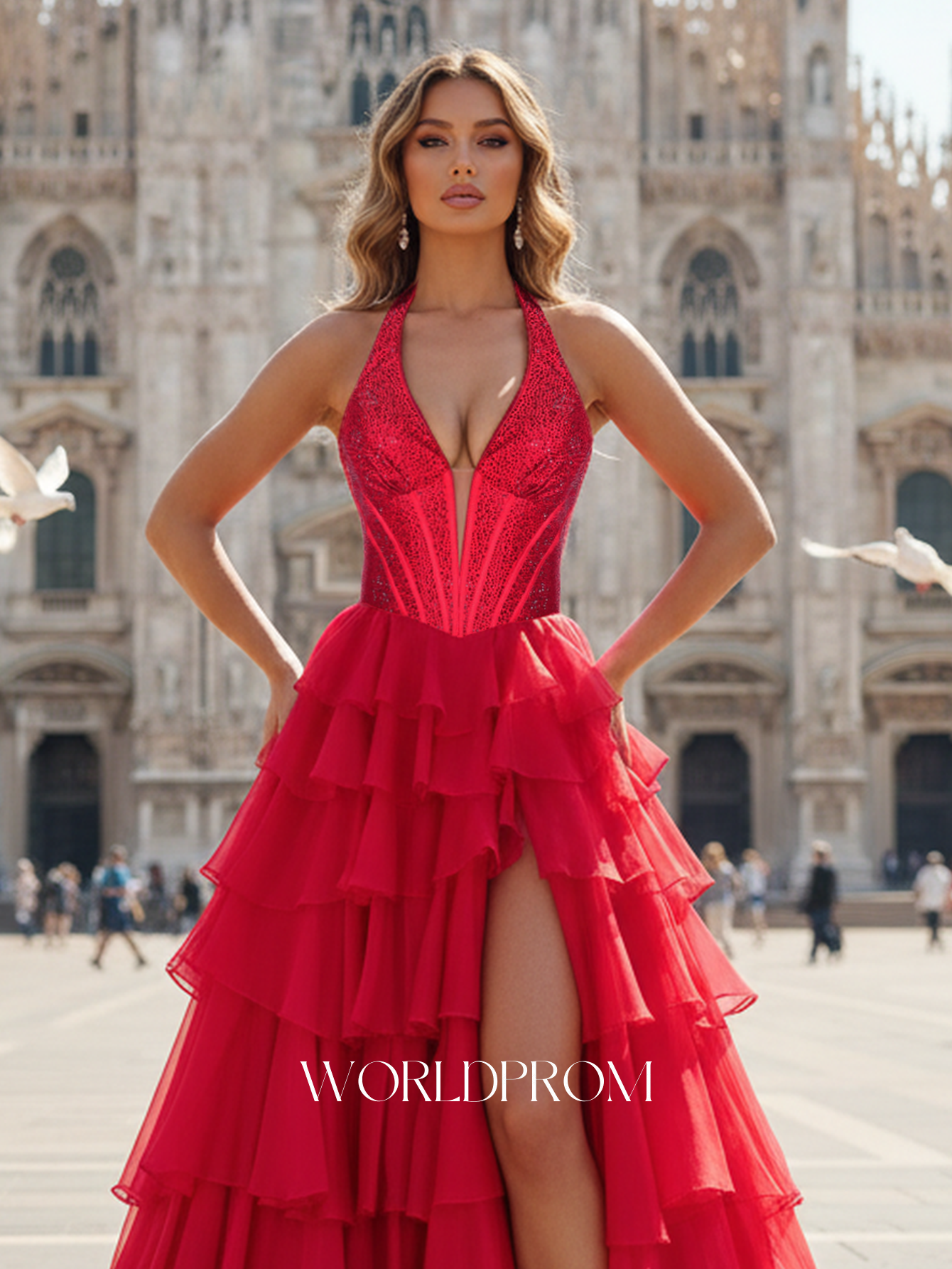 This chiffon prom gown features hot fix with crystal on the bodice. The halter dress has a V-neckline and ruffled split hem. Worldprom ball gown prom dresses are ideal for party, evening or festivals.