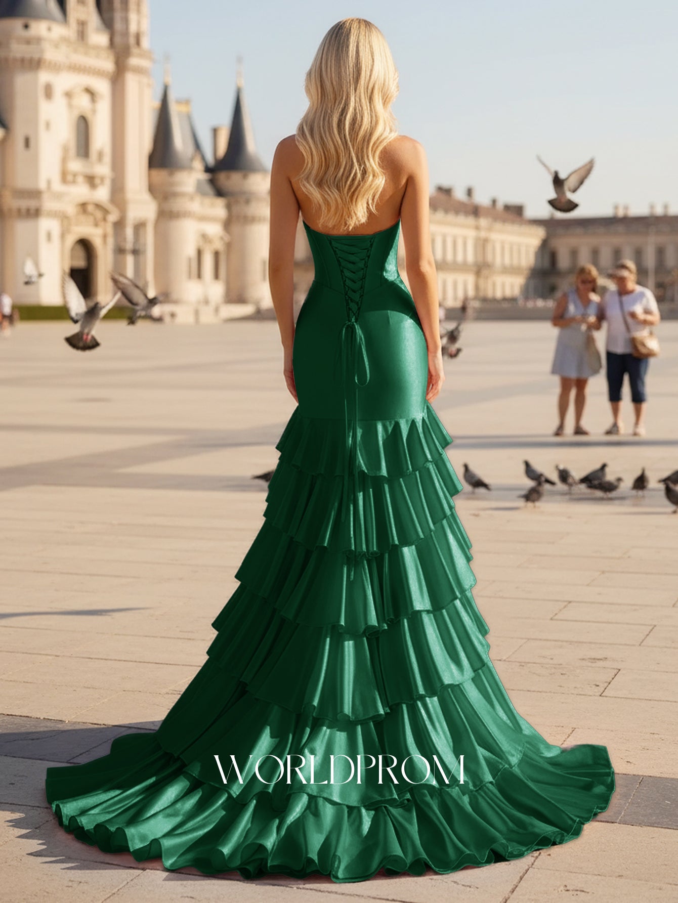This satin prom gown features ruched bust on the bodice. The halter ruffled dress has a V-neckline and split hem. Worldprom trumpet prom dresses are ideal for party, evening or festivals.