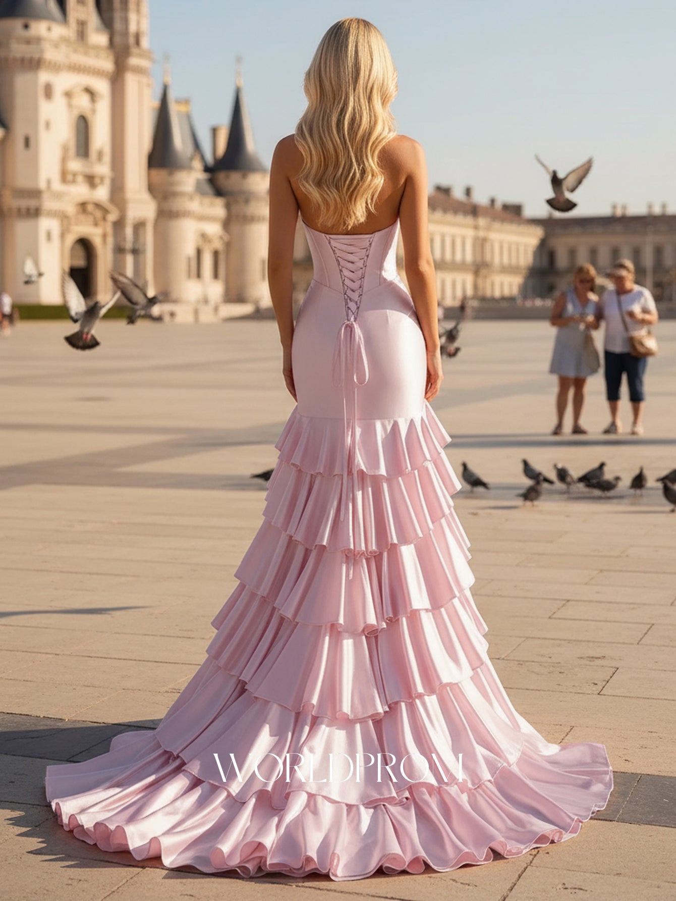 This satin prom gown features ruched bust on the bodice. The halter ruffled dress has a V-neckline and split hem. Worldprom trumpet prom dresses are ideal for party, evening or festivals.