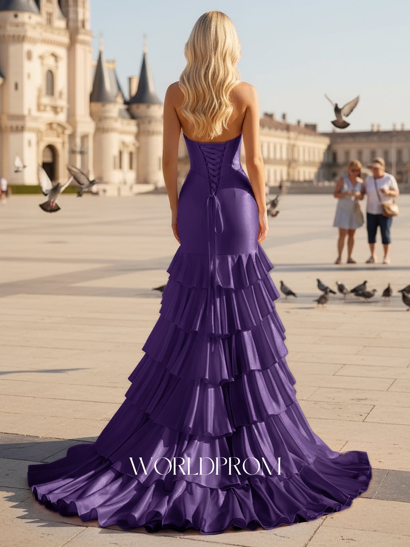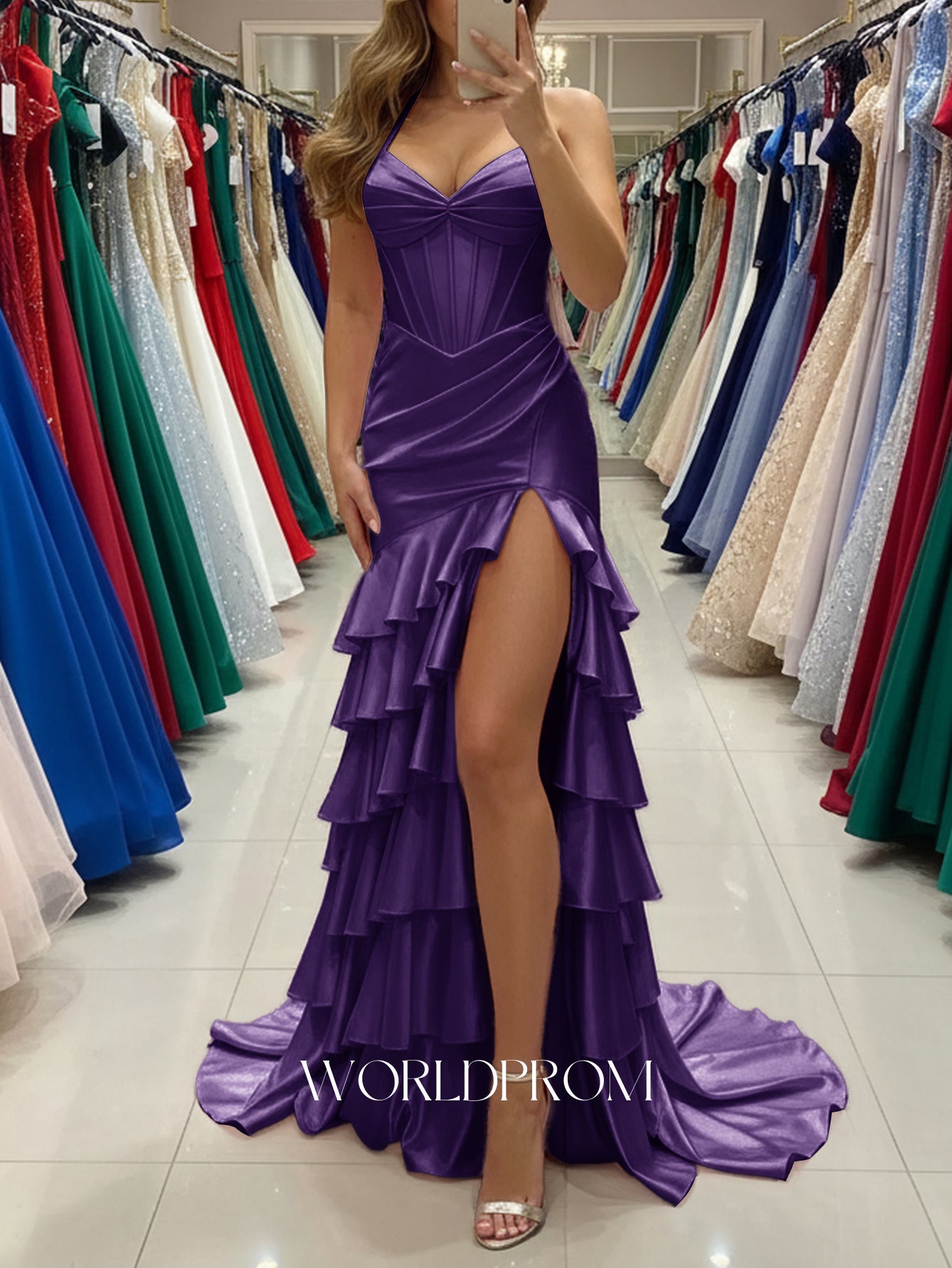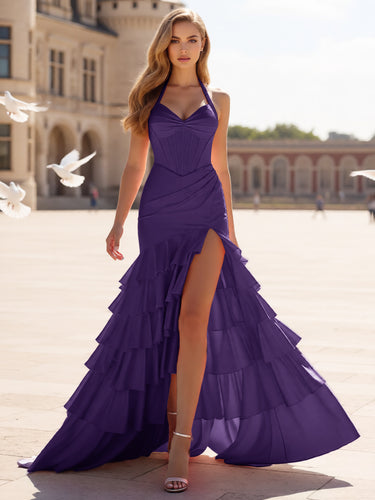 Halter Pleated Ruched Bust Layered Ruffle Hem Long Mermaid Prom Dress With Slit - Purple