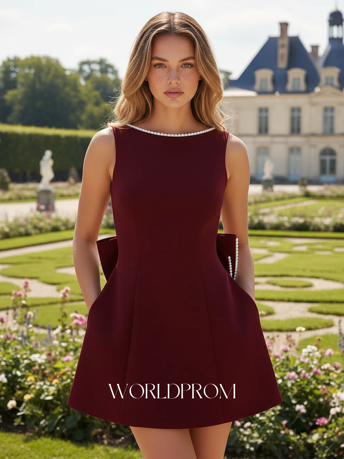 Hand Beading Backless Bow Ball Gown Prom Bridal Mini Dress - Burgundy