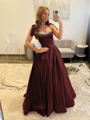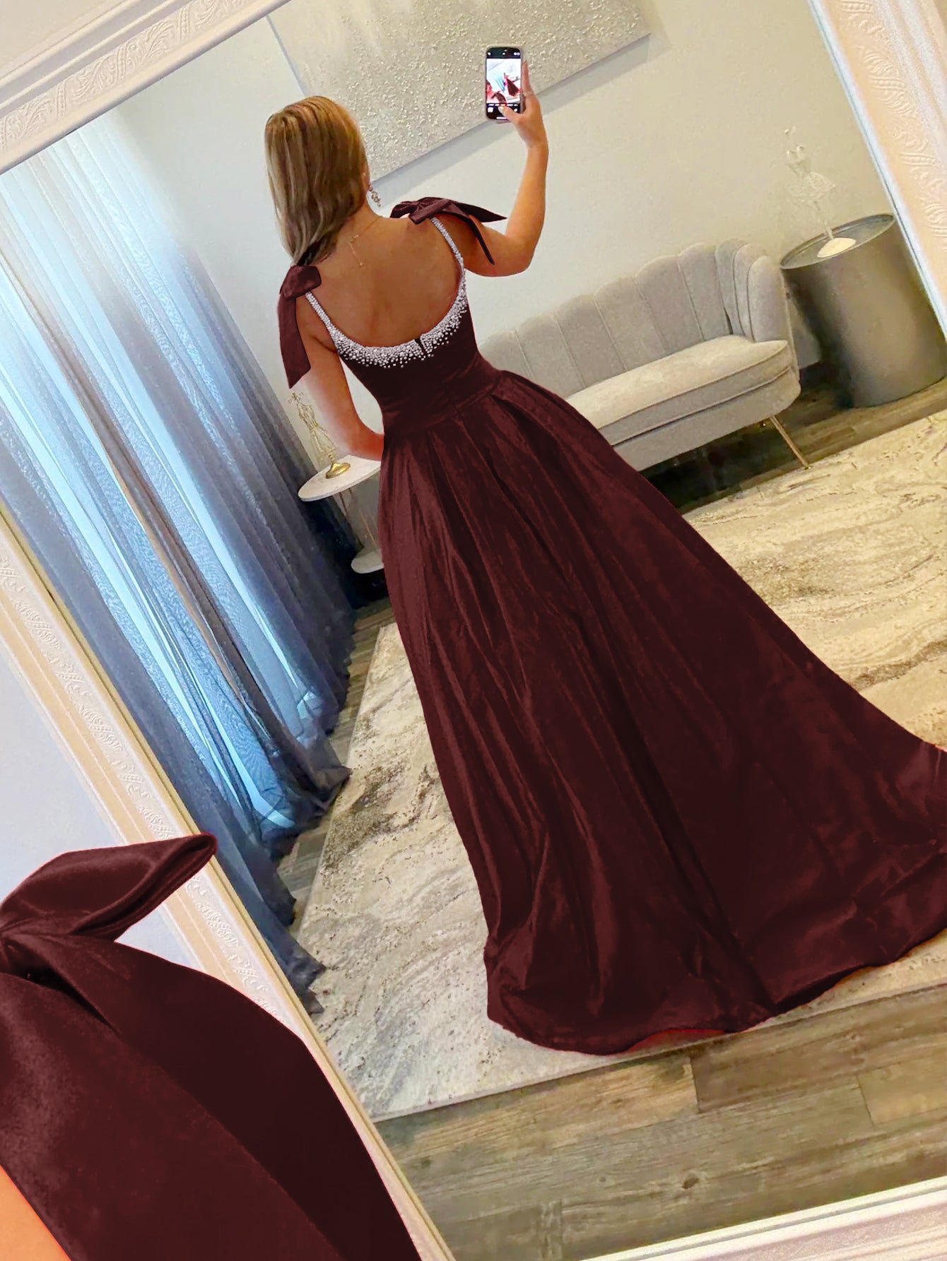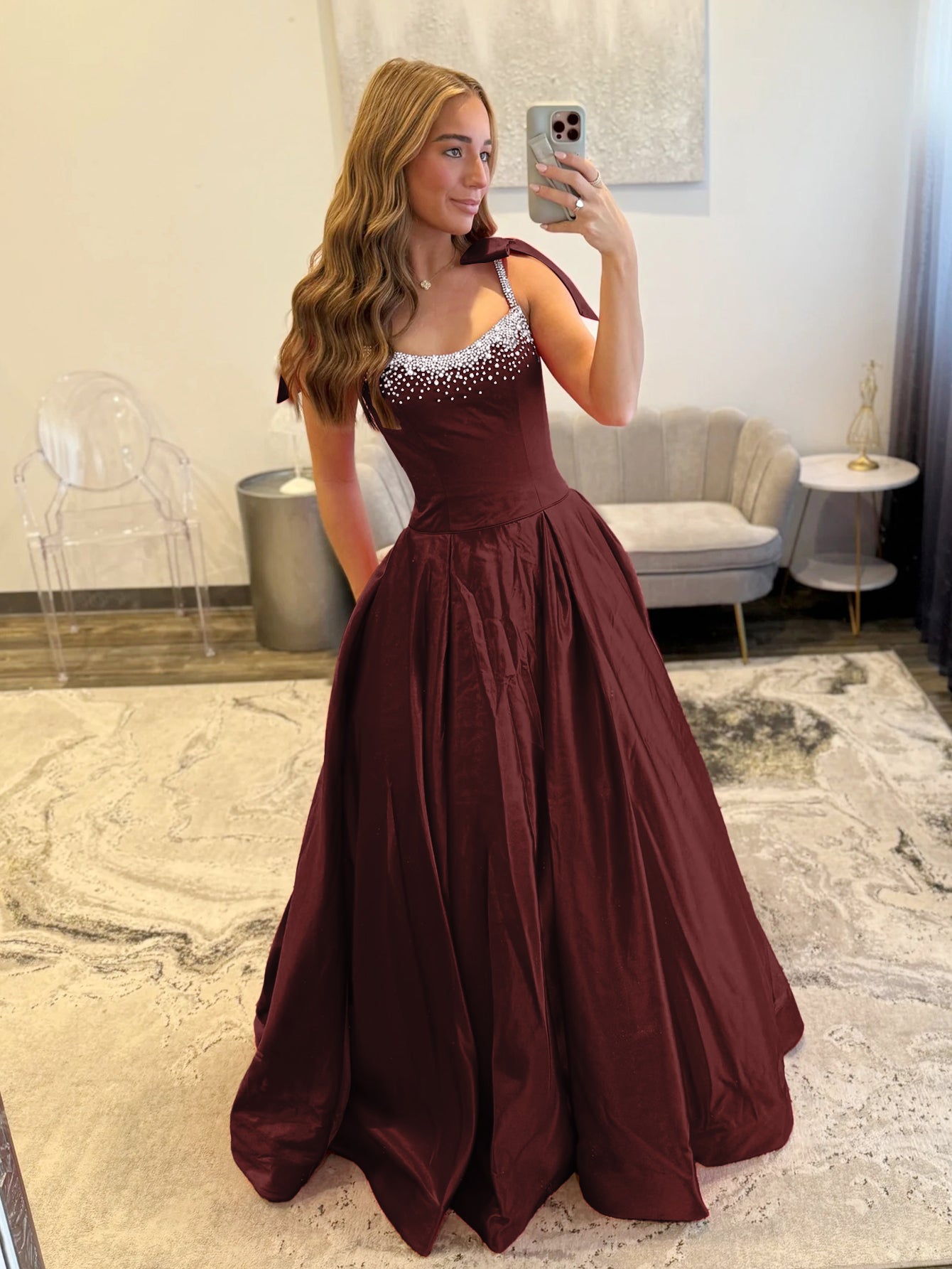 This satin prom gown features hand-beading with bows on the bodice. The long evening dress has a scoop neckline and ball gown hem. This formal dress is ideal for party, evening or festivals.
