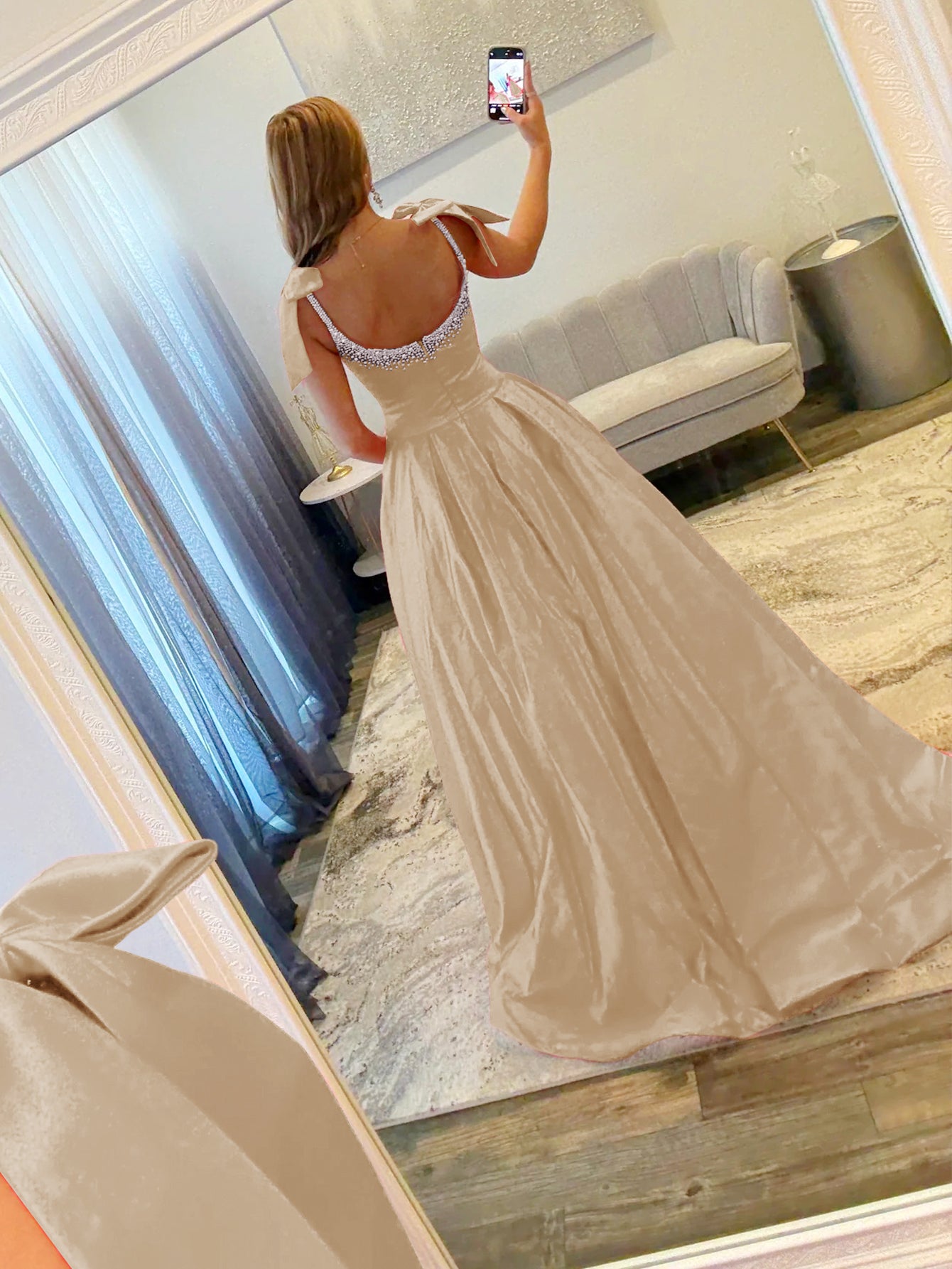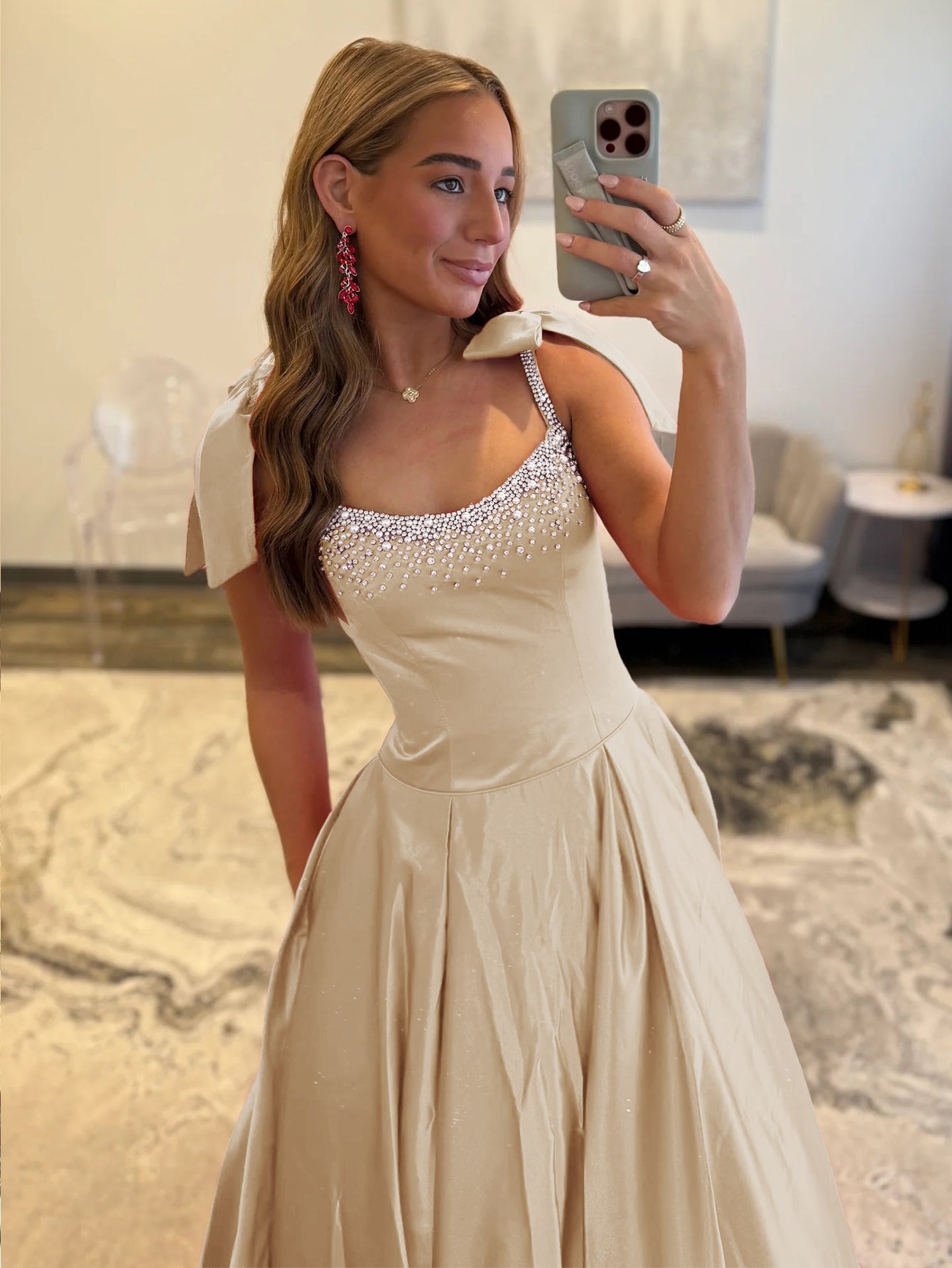 This satin prom gown features hand-beading with bows on the bodice. The long evening dress has a scoop neckline and ball gown hem. This formal dress is ideal for party, evening or festivals.