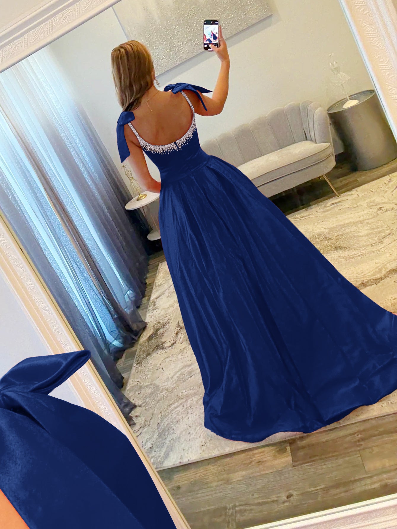This satin prom gown features hand-beading with bows on the bodice. The long evening dress has a scoop neckline and ball gown hem. This formal dress is ideal for party, evening or festivals.