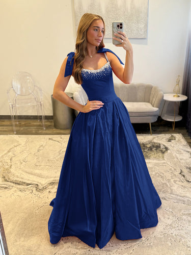 Hand Beading Bodice Ball Gown Prom Dress With Bows - Royal Blue