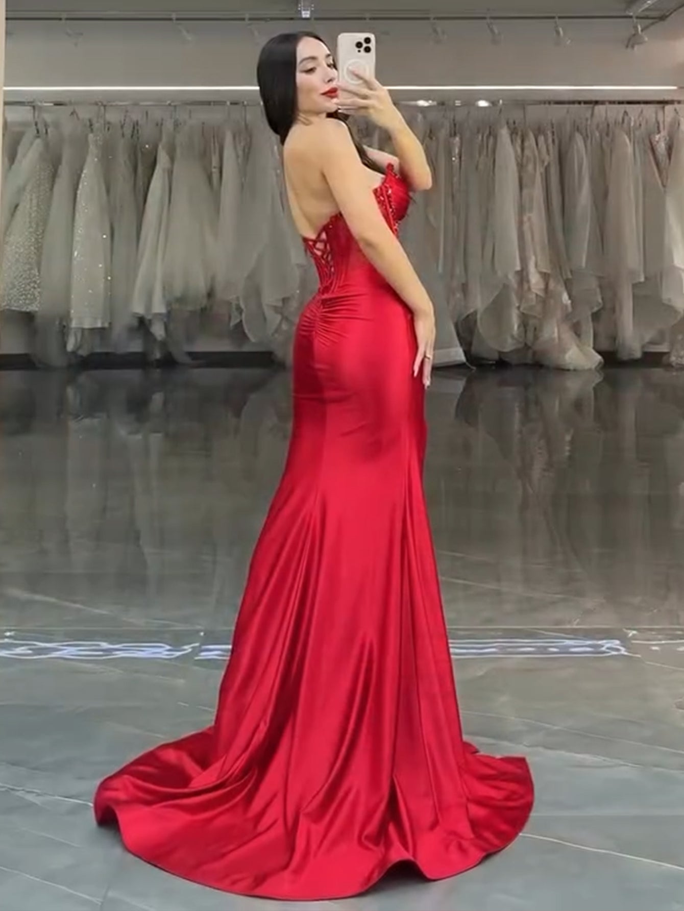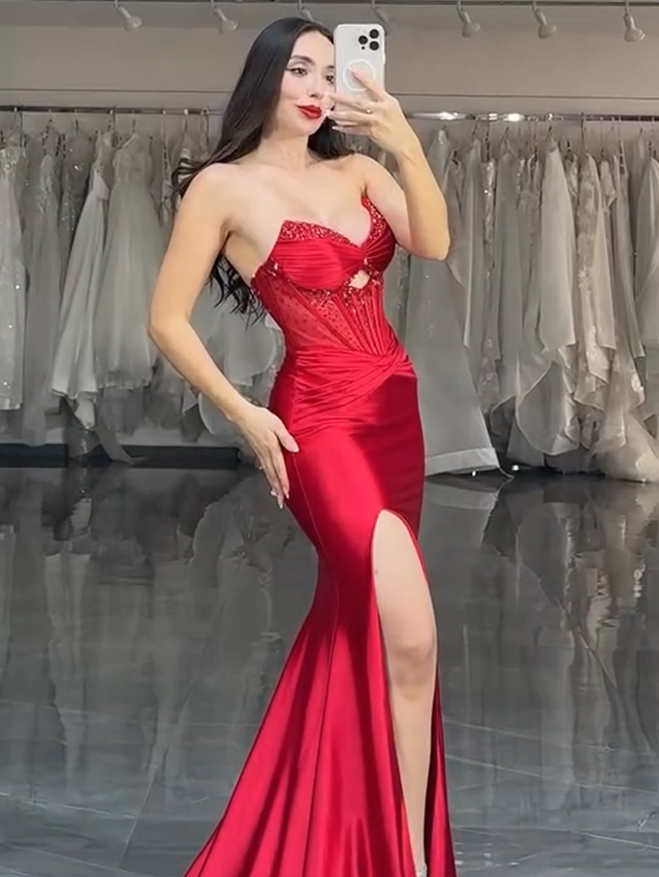 This stretch satin prom gown features hand-beading and cutout crystals on the illusion bodice. The strapless maxi sheer dress has a sweetheart neckline and pleated hem. This mermaid split dress is ideal for party, evening or festivals.