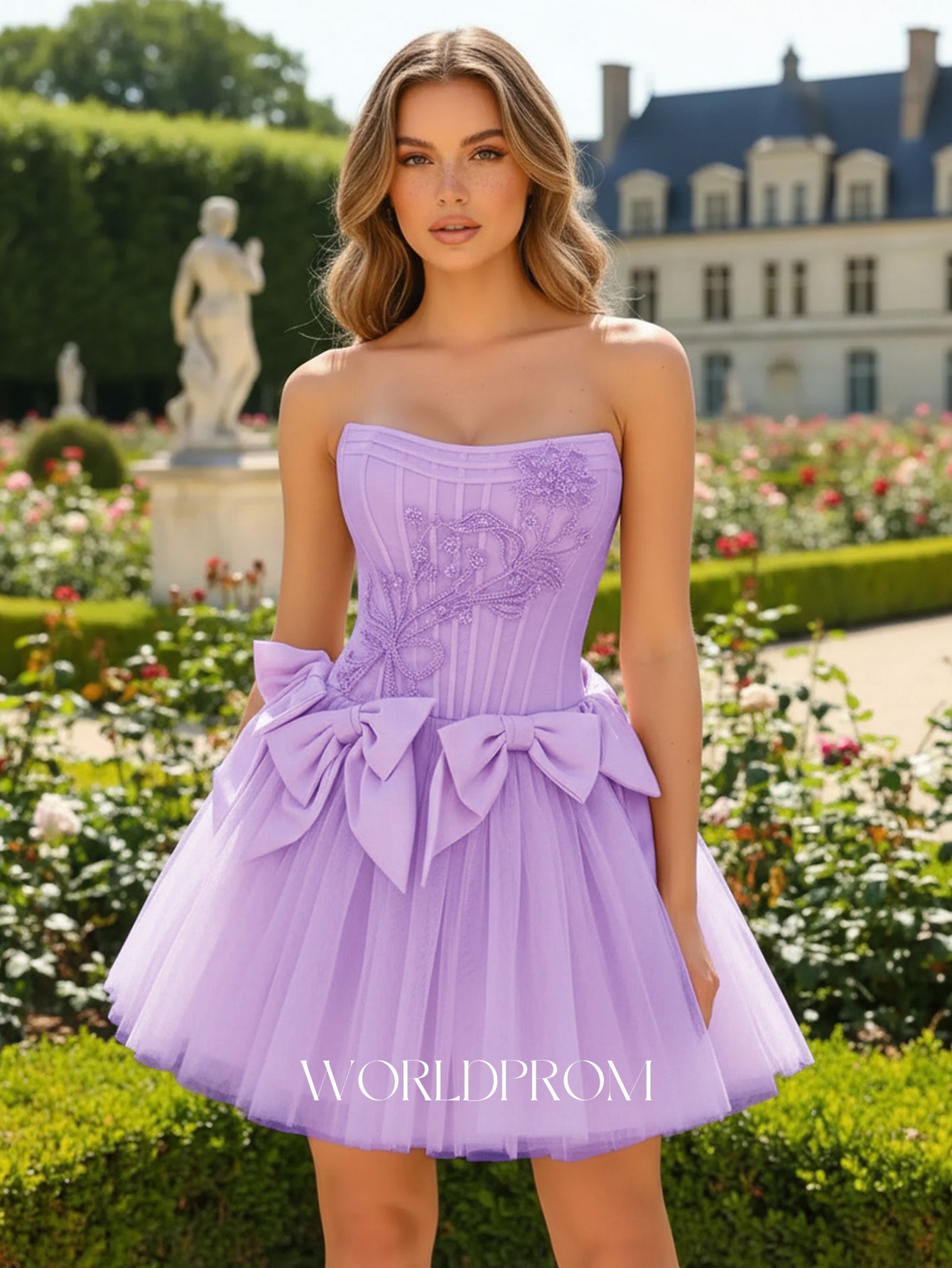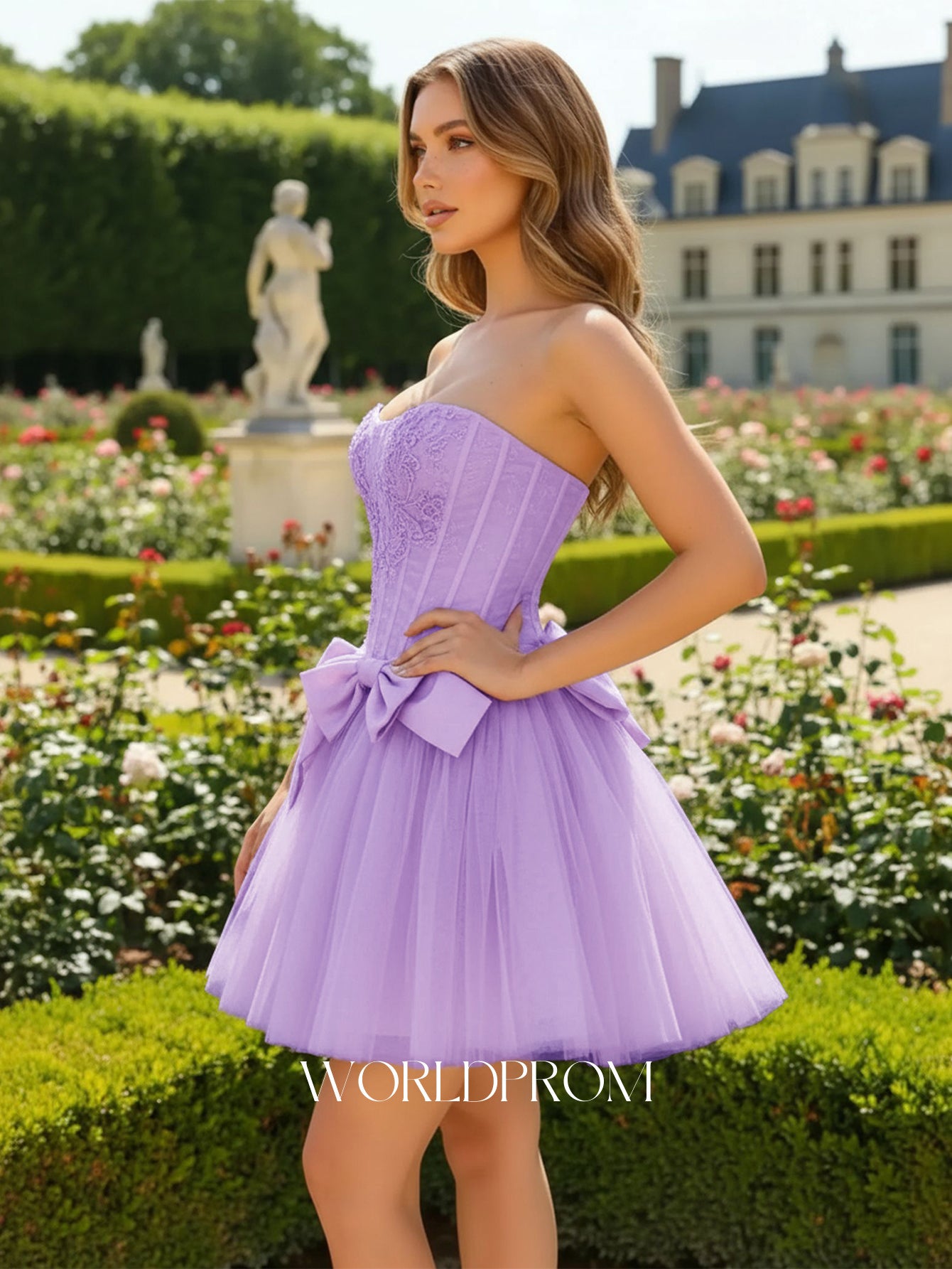 Hand Beading Boned Mini Ball Gown Prom Dress With Bow - Lilac