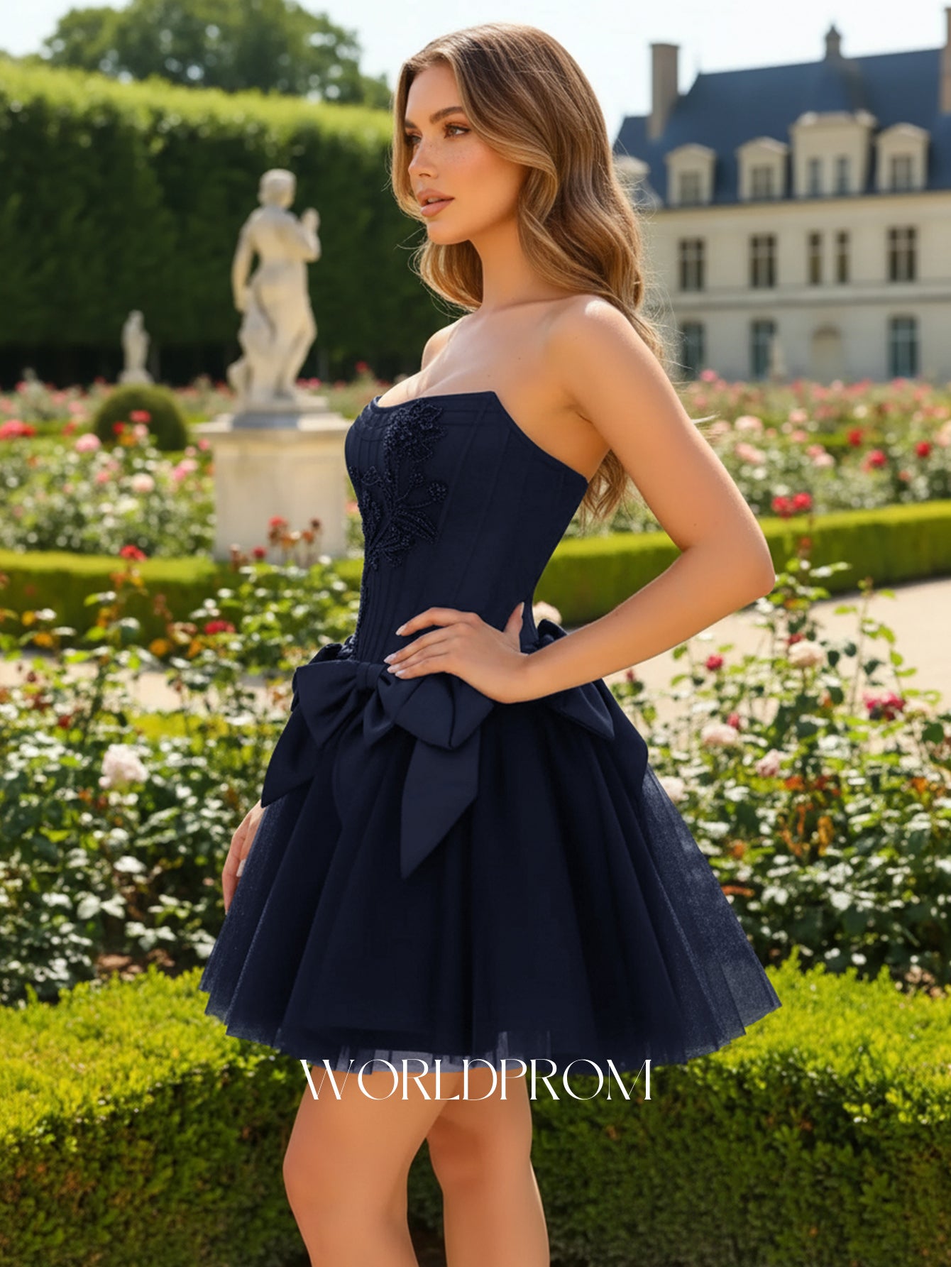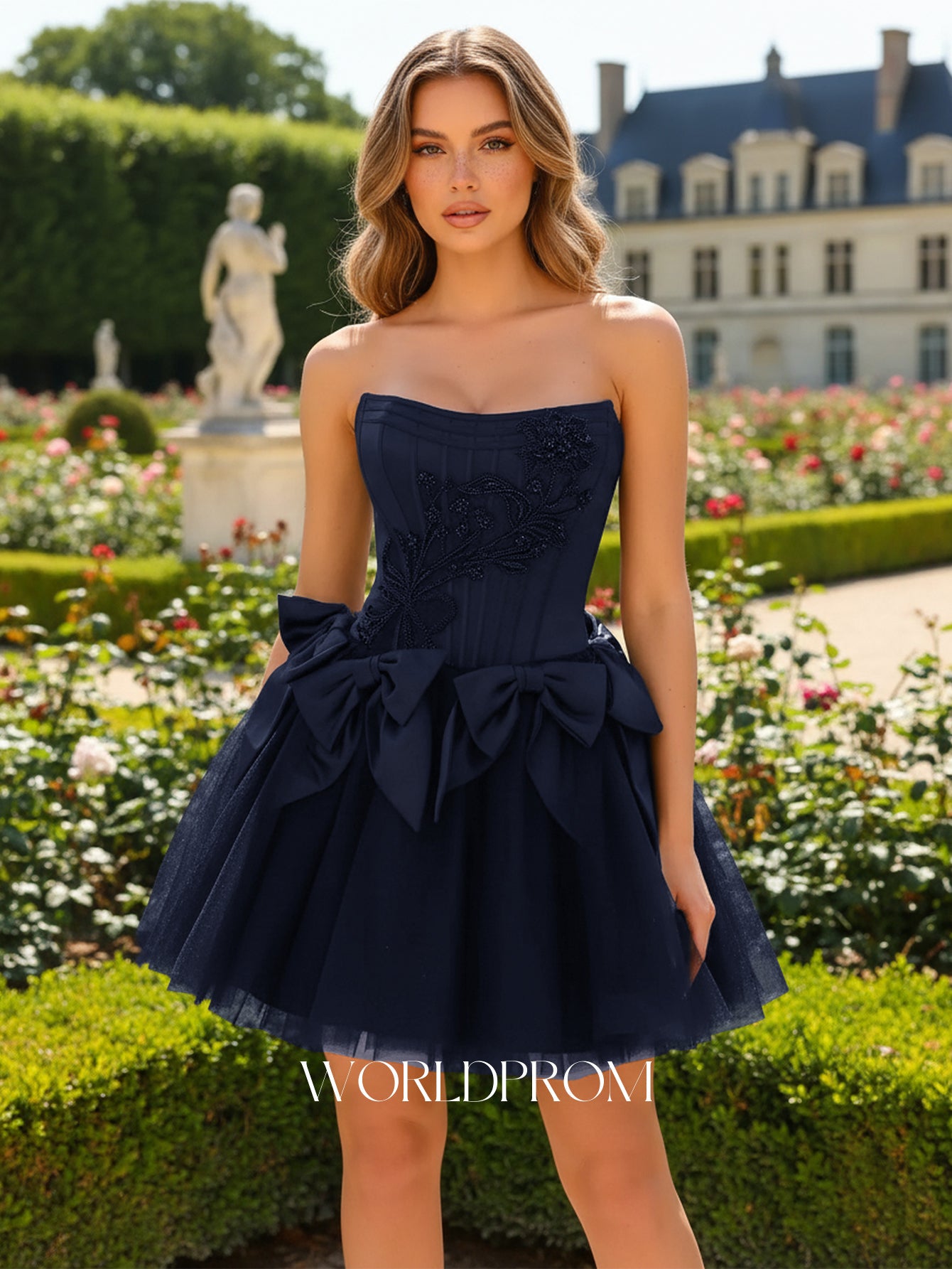 Hand Beading Boned Mini Ball Gown Prom Dress With Bow - Navy Blue