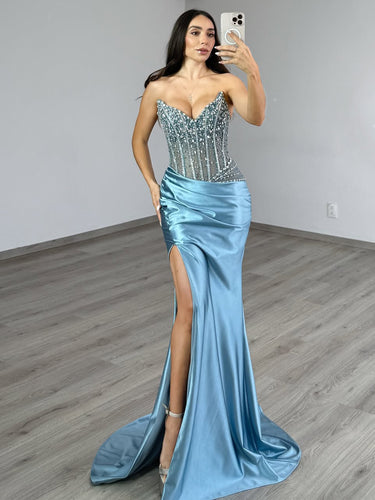 This satin prom dress features hand-beading with crystals on the illusion bodice. The strapless mermaid dress has a V-neckline and split hem. Ruched sparkly dresses are ideal for party, evening or festivals.
