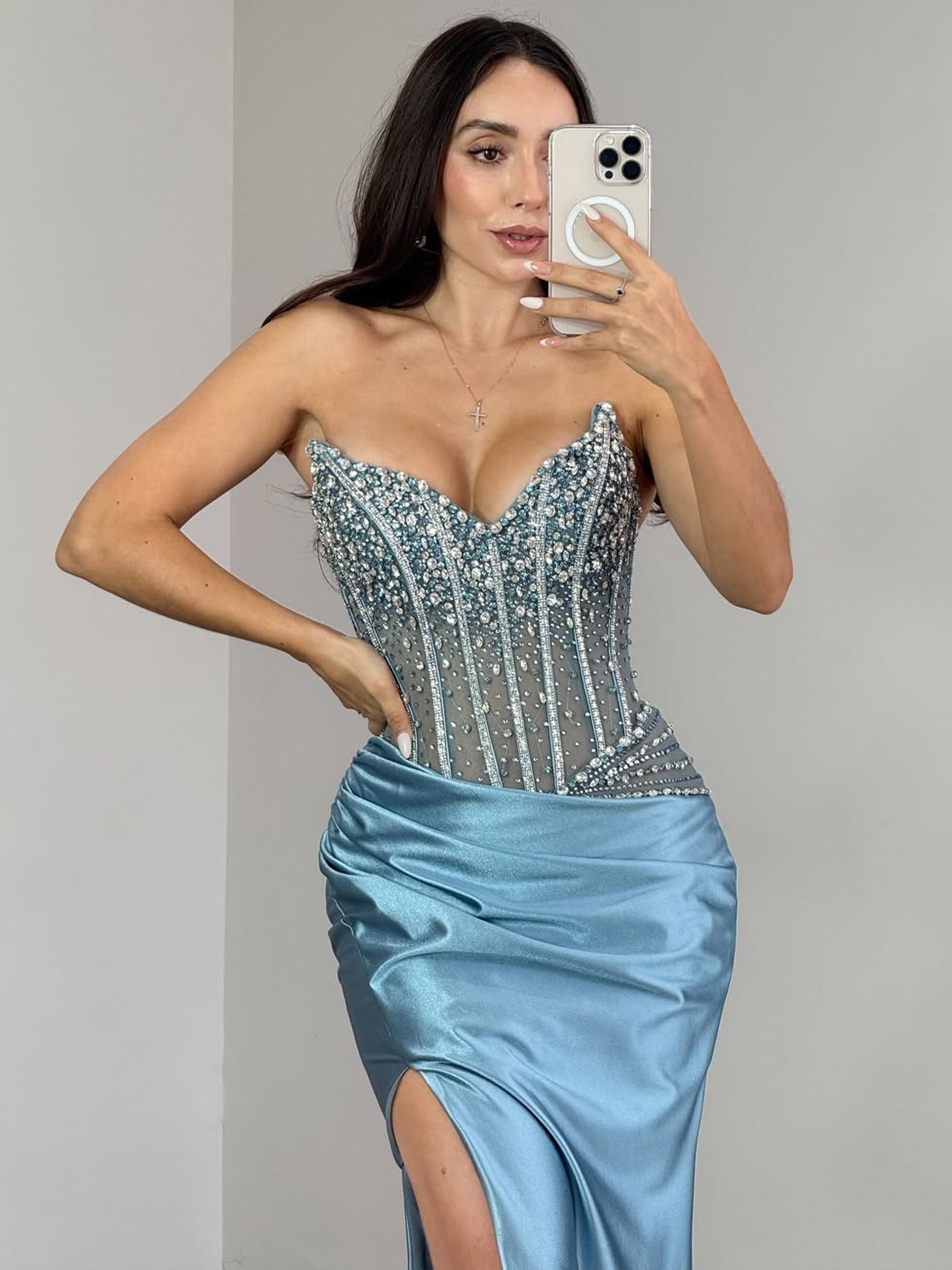 Hand Beading Crystal Illusion Boned Mermaid Prom Dress - Dusty Blue