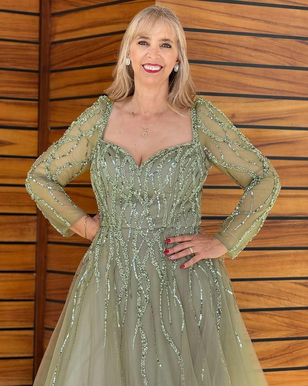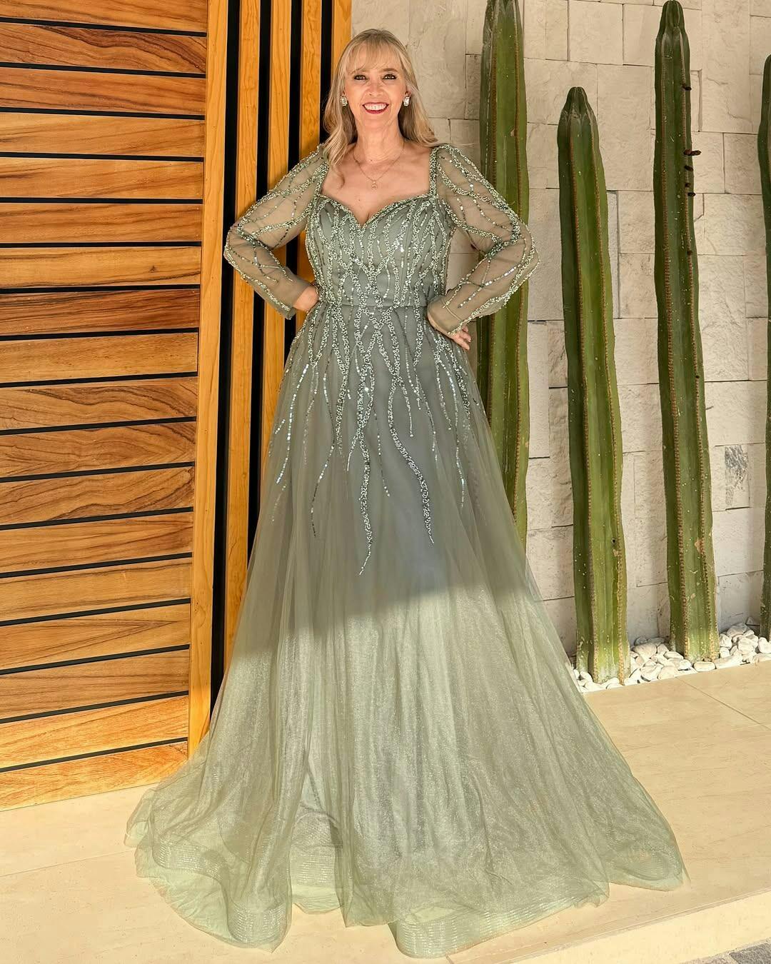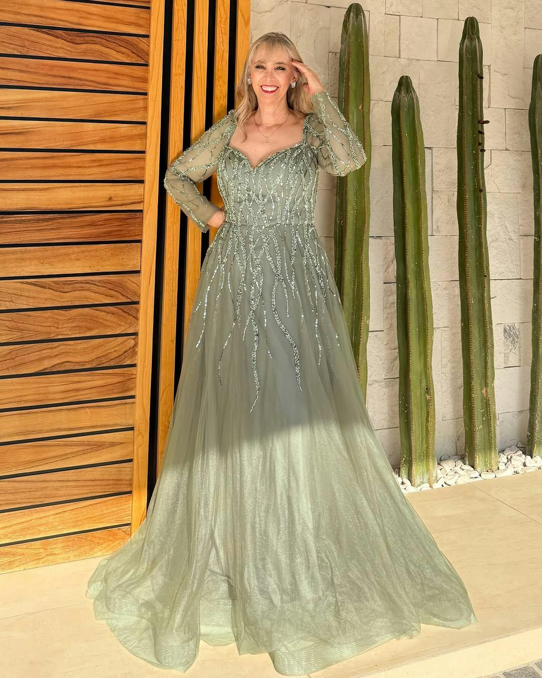 Hand Beading Long Sleeves Illusion Prom Dress - Olive Green