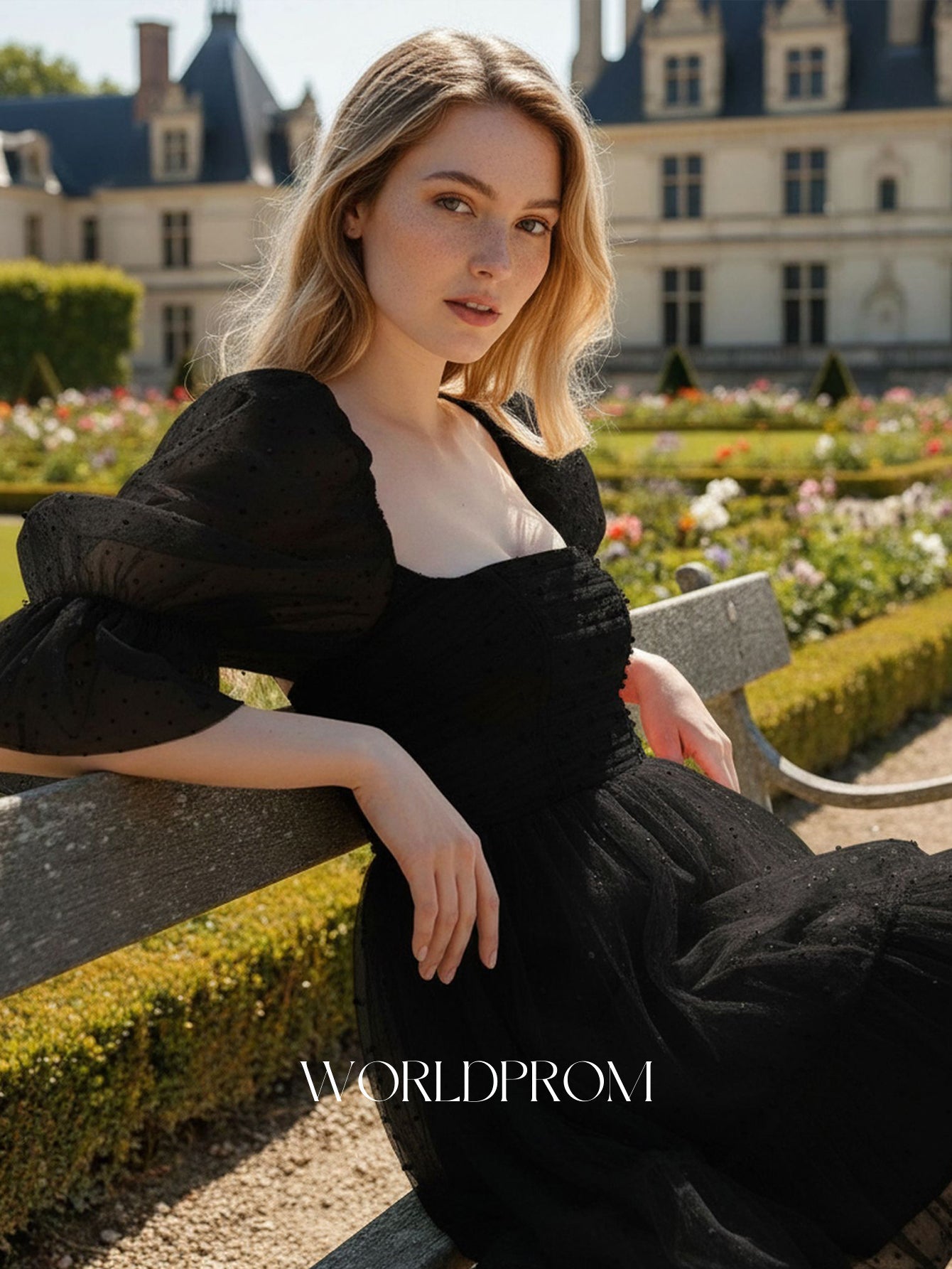 Details: Backless, Fitted Waist, Hand Beading, Puff Sleeve, Ruffle