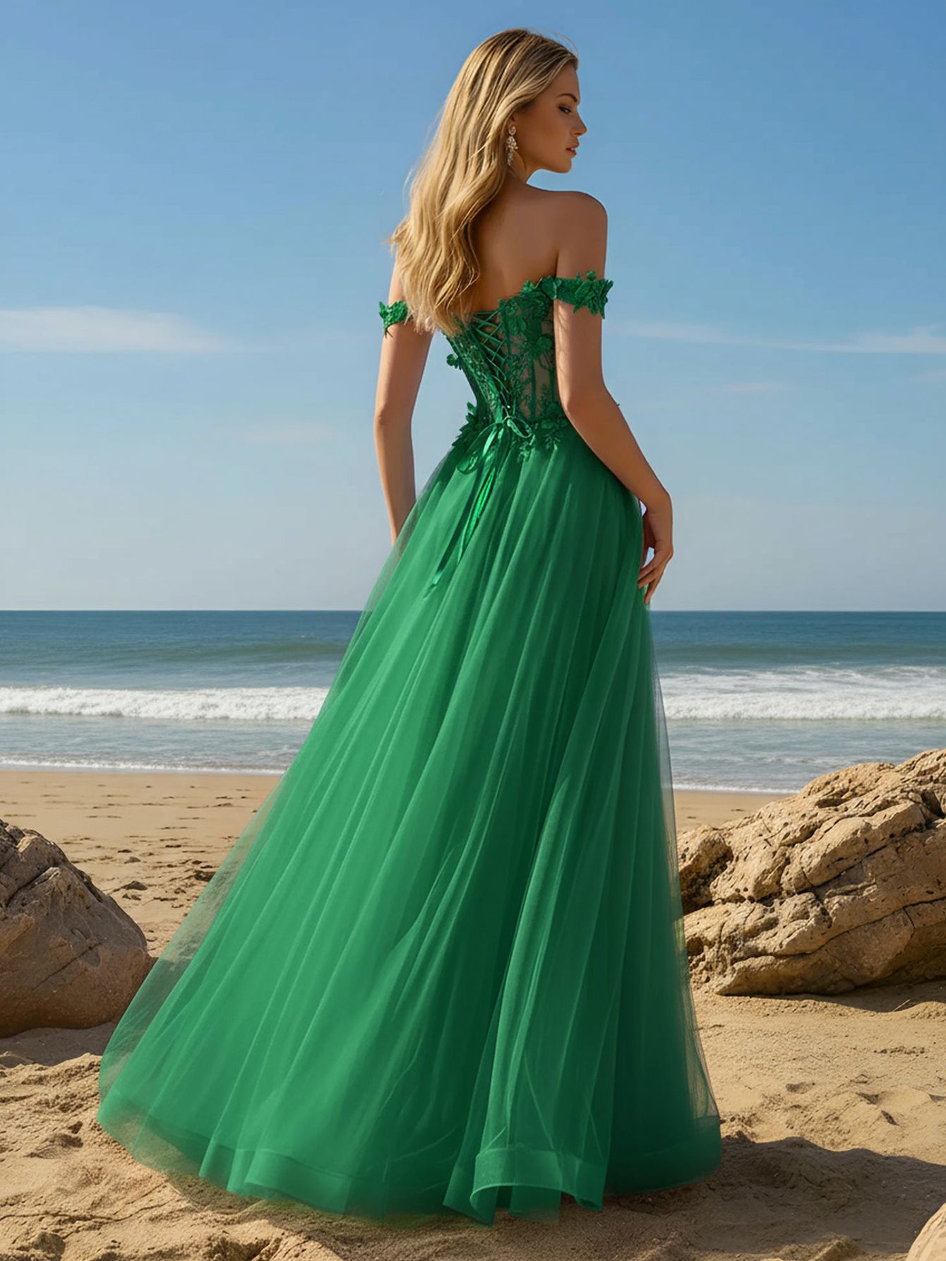 This tulle prom gown features 3d flowers on the illusion bodice. The off-shoulder maxi dress has a V-