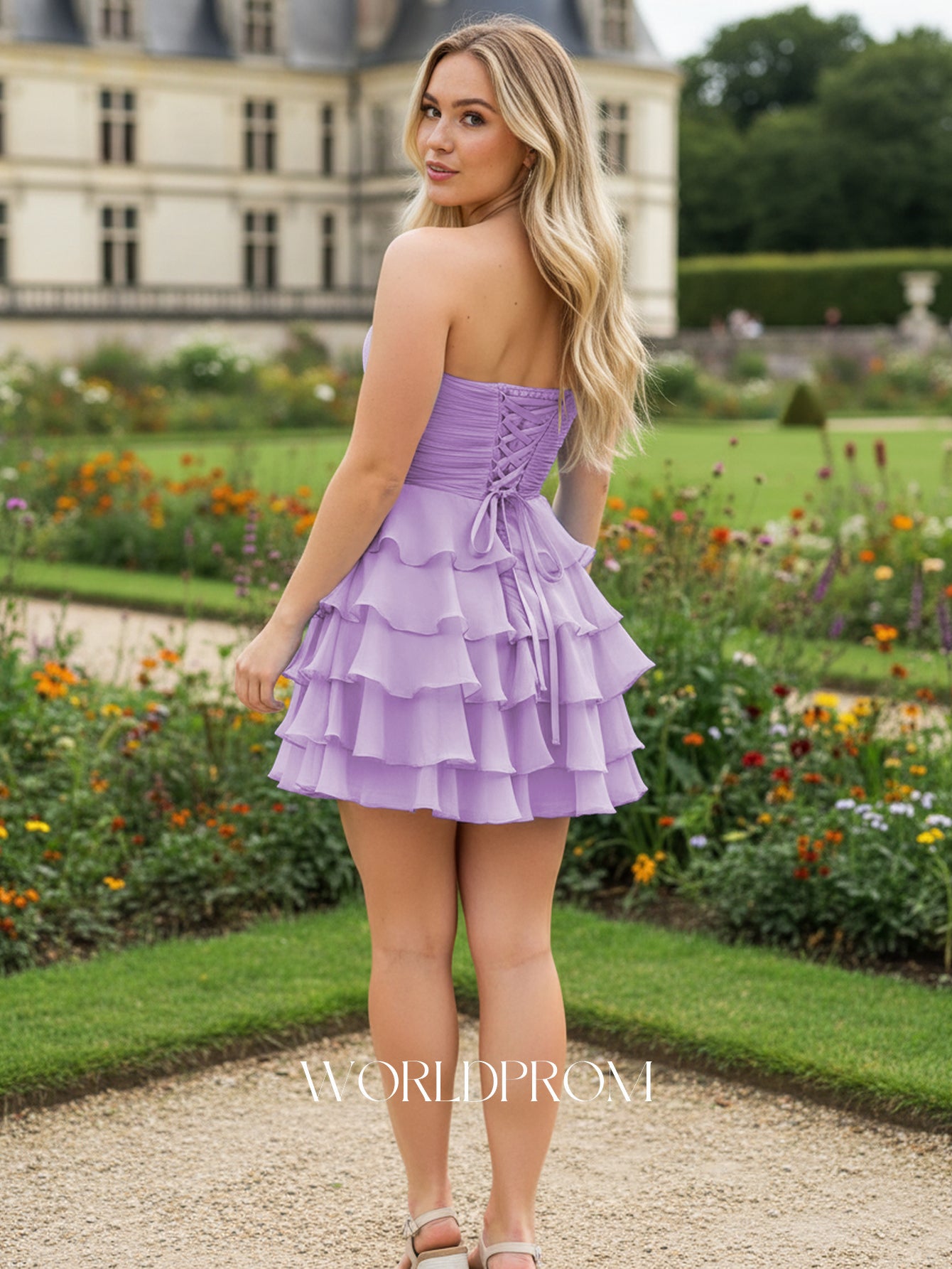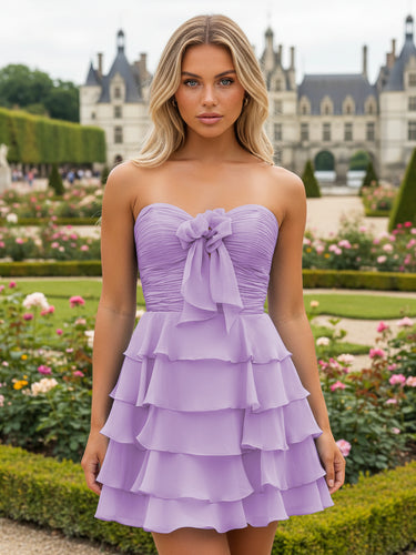 This chiffon mini prom gown features hand made flower with bow on the bodice. The strapless hoco dress has a sweetheart neck and layered hem. The short party dress is ideal for graduation party, homecoming or prom party.