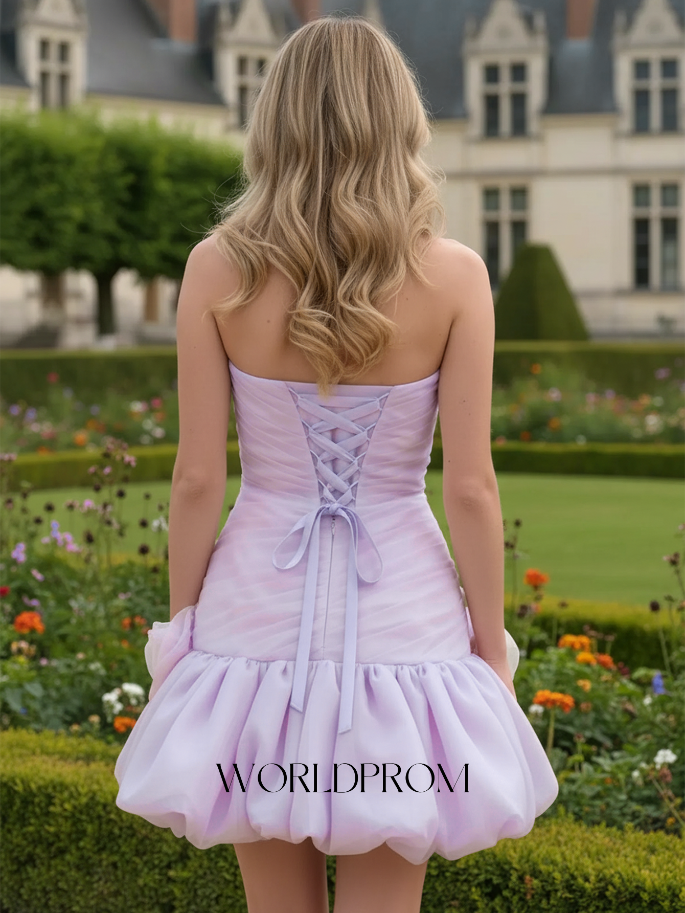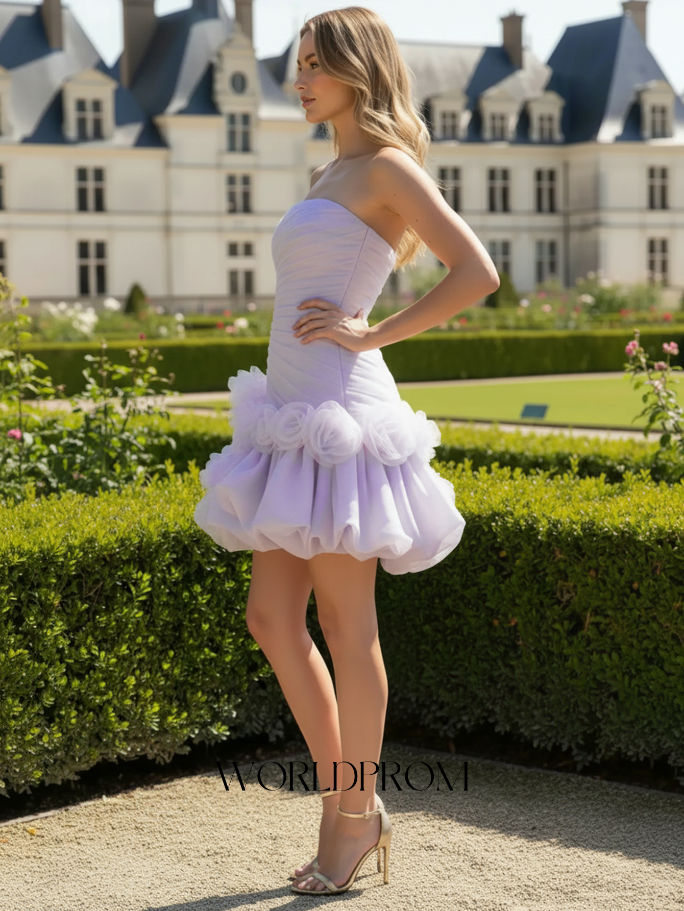 This organza mini prom gown features hand-made flowers on the bodice. The strapless homecoming dress has a ruched bust and tiered hem. The short puffy dress is ideal for graduation party, homecoming or prom party.