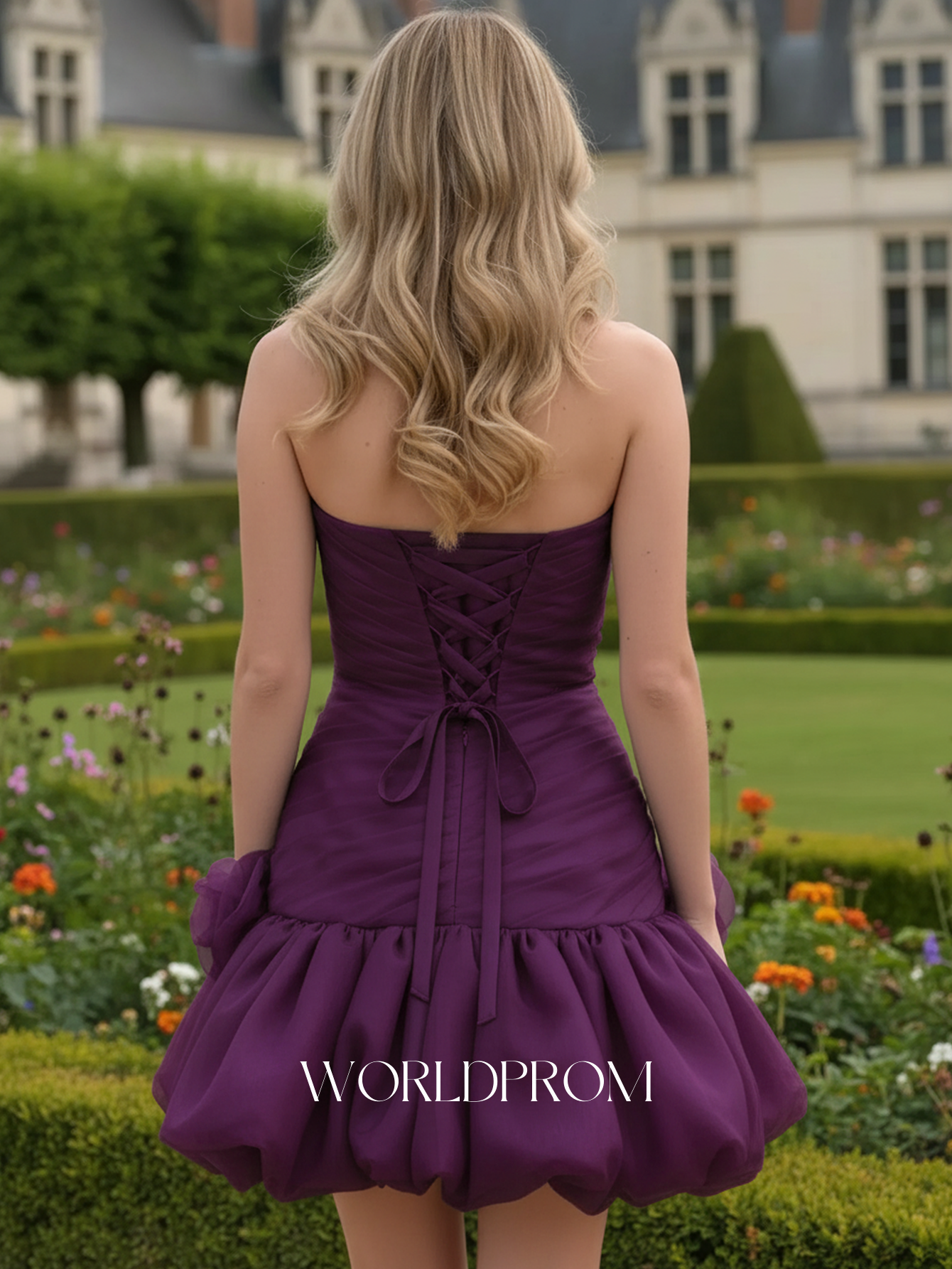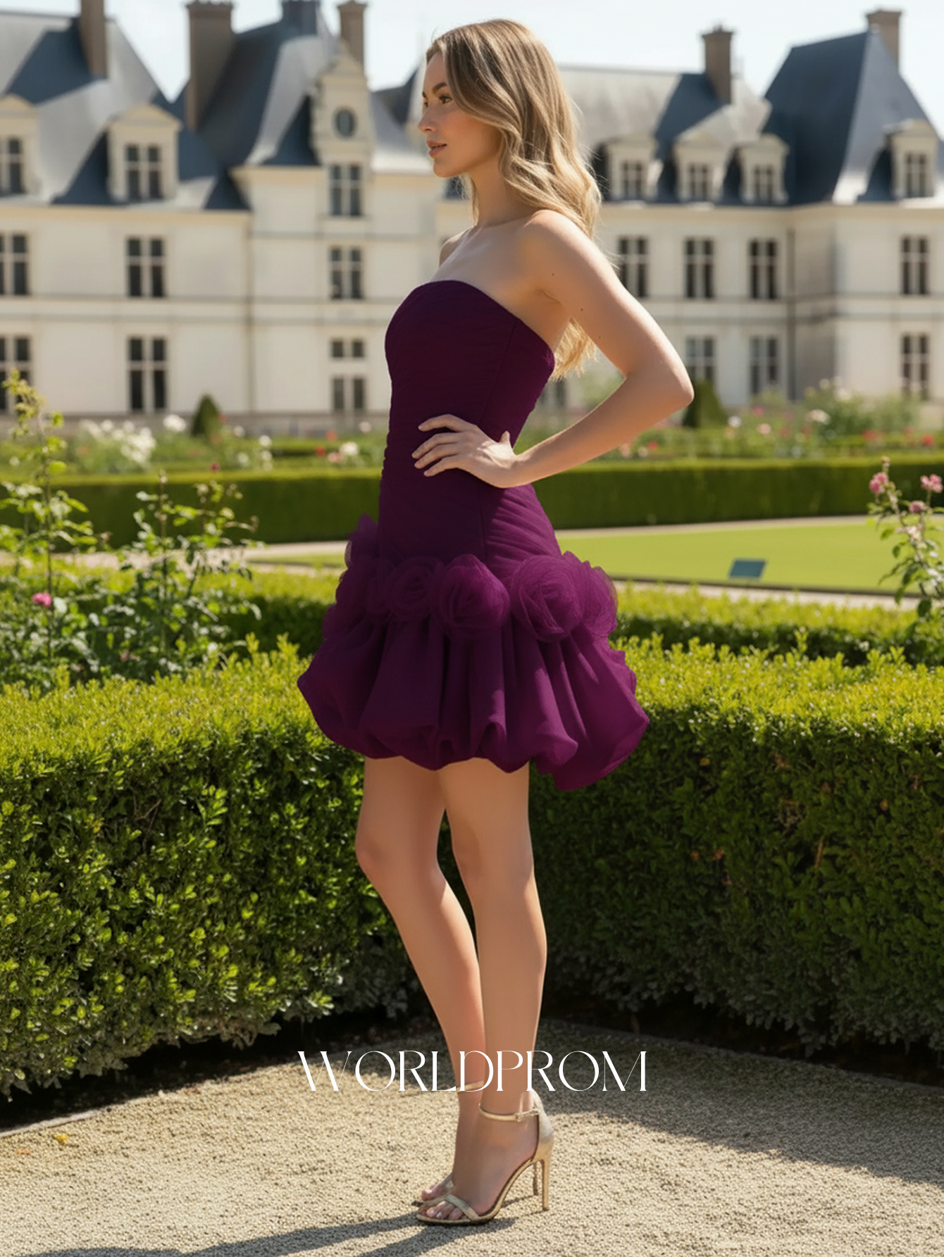 This organza mini prom gown features hand-made flowers on the bodice. The strapless homecoming dress has a ruched bust and tiered hem. The short puffy dress is ideal for graduation party, homecoming or prom party.