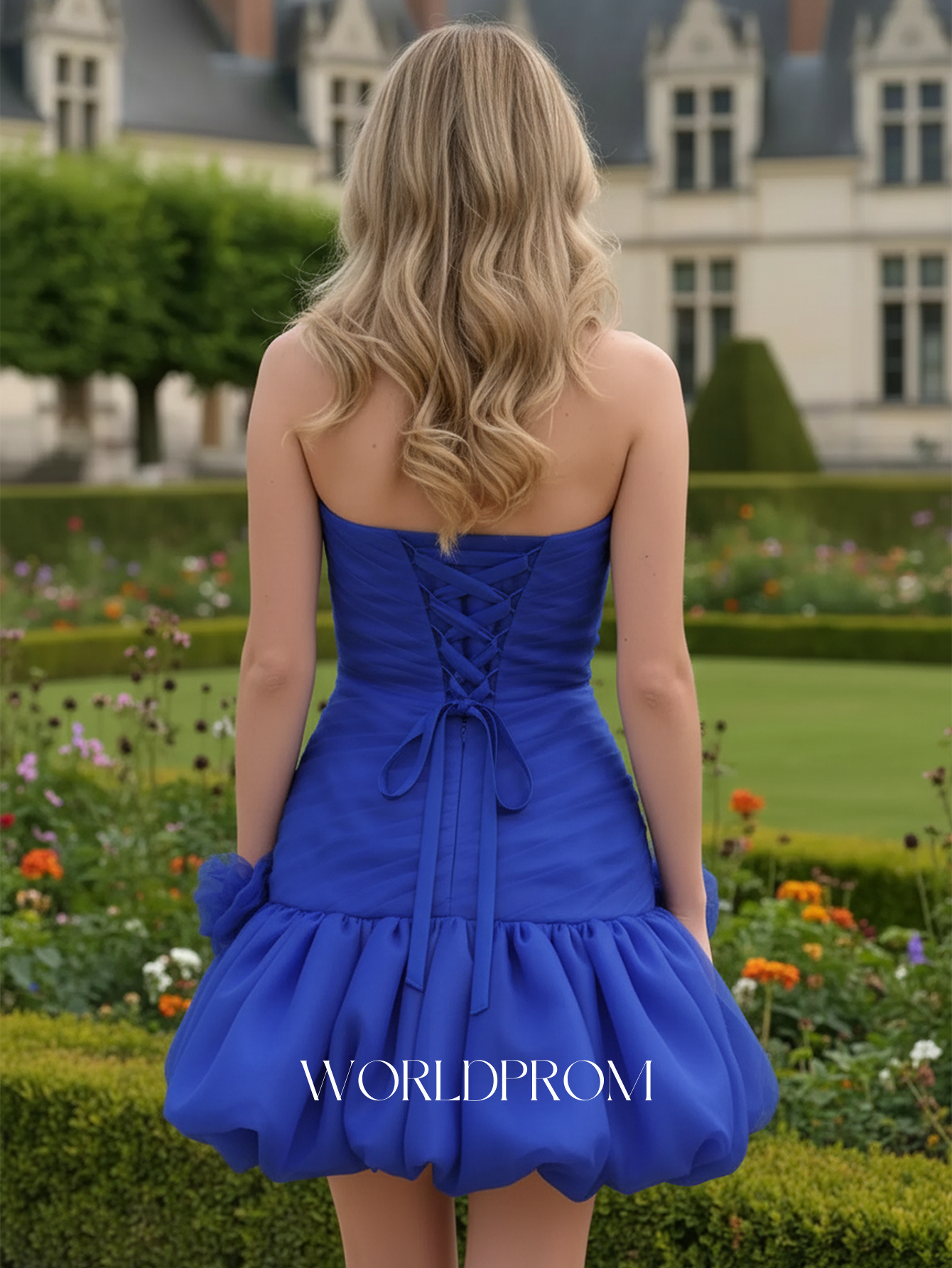 This organza mini prom gown features hand-made flowers on the bodice. The strapless homecoming dress has a ruched bust and tiered hem. The short puffy dress is ideal for graduation party, homecoming or prom party.