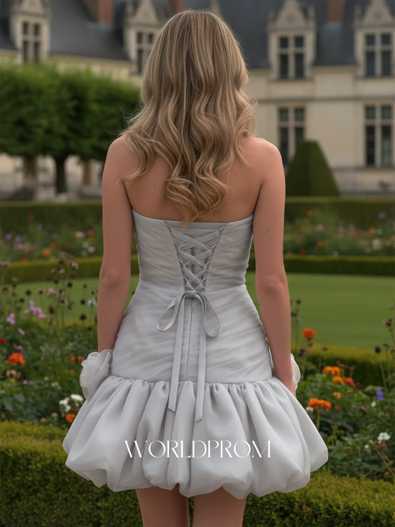 This organza mini prom gown features hand-made flowers on the bodice. The strapless homecoming dress has a ruched bust and tiered hem. The short puffy dress is ideal for graduation party, homecoming or prom party.