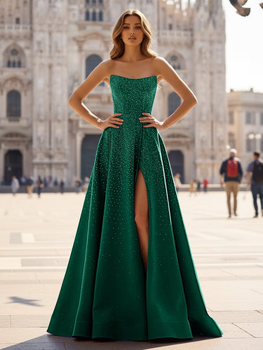 This satin prom gown features crystal bust with hot fix on the bodice. The strapless dress has a scoop neckline and pleated split hem. Worldprom a-line prom dresses are ideal for party, evening or festivals.