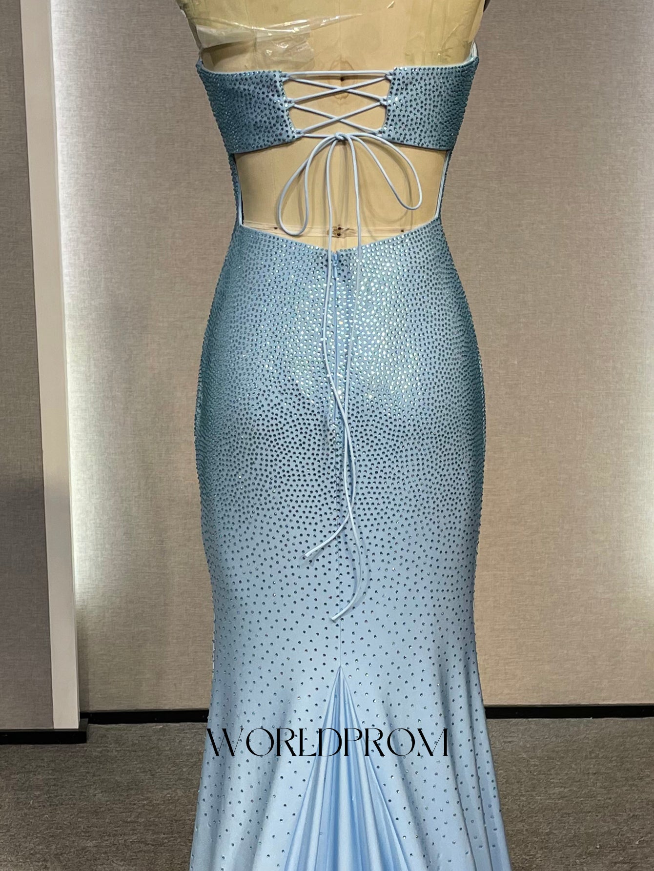 Hot Fix Crystal Corset Backless Mermaid Long Prom Dress With Slit - Sky Blue