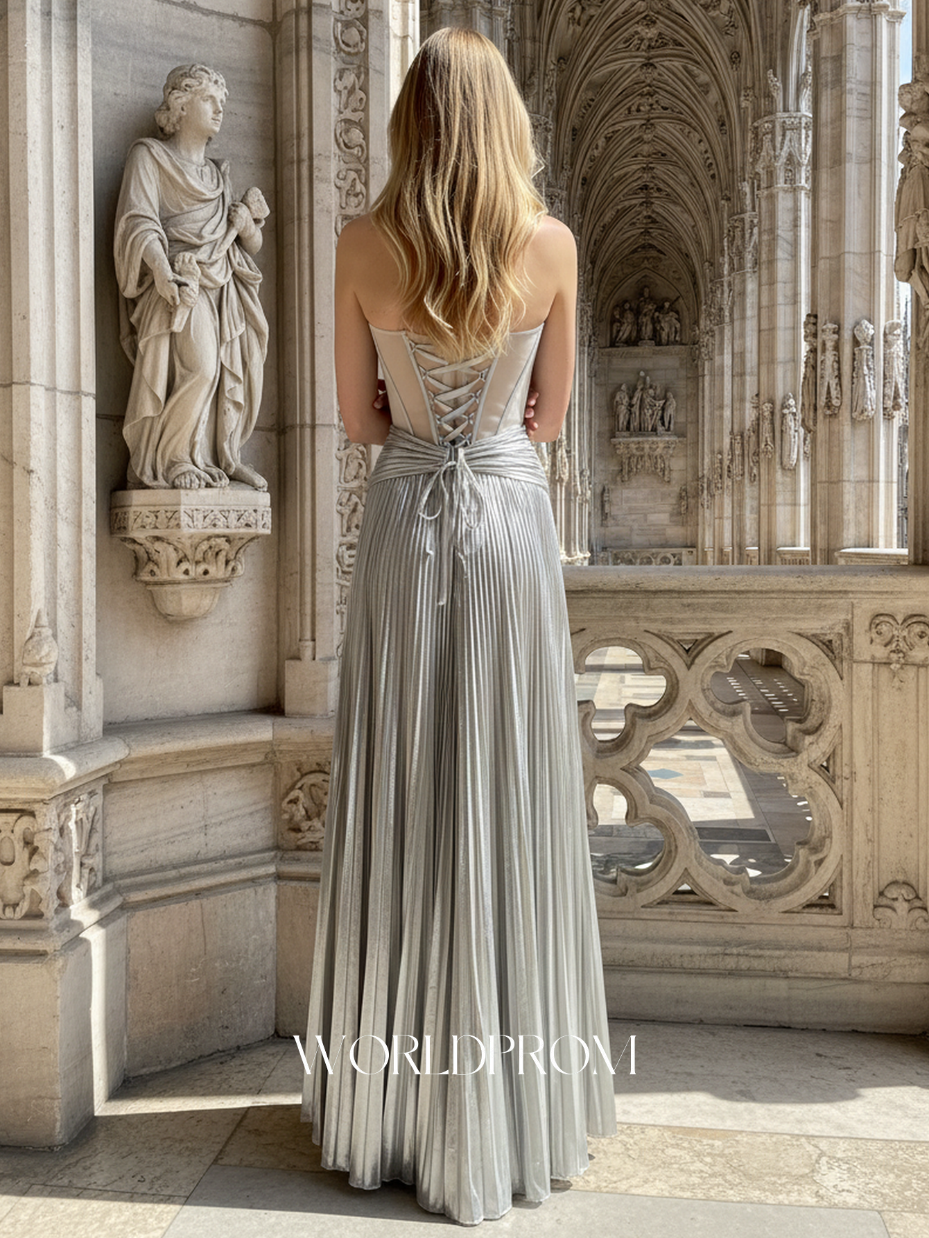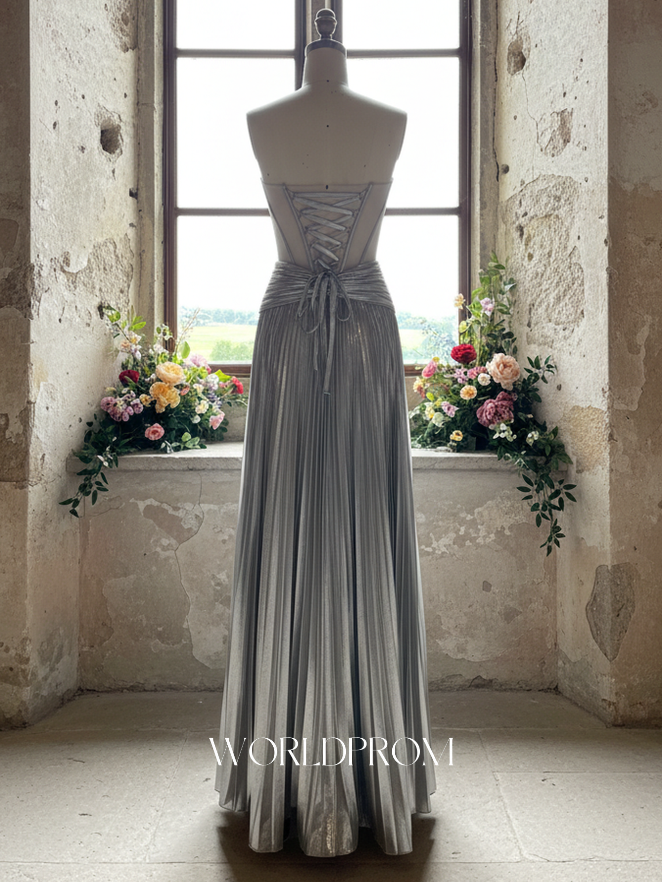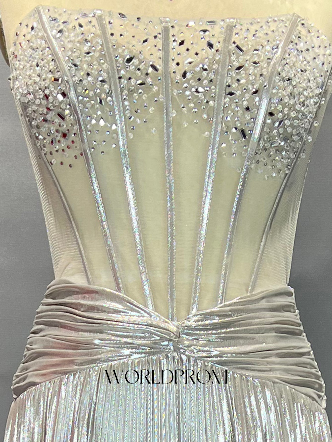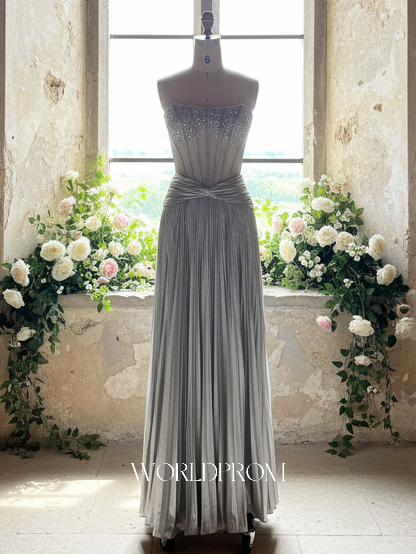 This satin prom gown features crystal bust with hot fix on the illusion bodice. The strapless dress has a scoop neckline and pleated hem. Worldprom a-line prom dresses are ideal for party, evening or festivals.