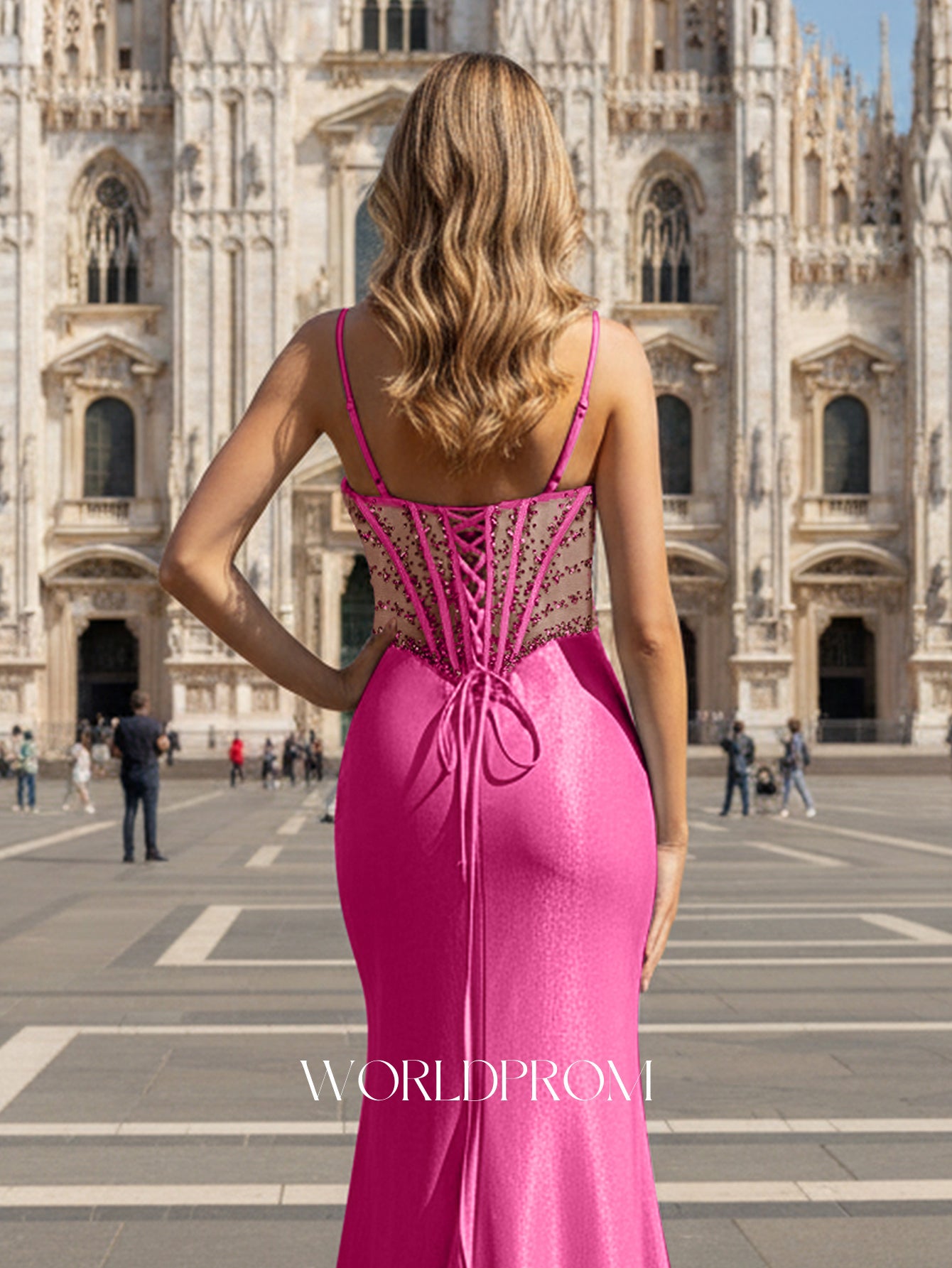 This satin prom gown features hot fix crystal on the illusion bodice. The strapless dress has a V-neckline and ruffle hem with split. Worldprom mermaid prom dresses are ideal for party, evening or festivals.