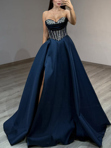 This satin prom gown features hot fix on the ruched bust. The crystal strapless dress has a sweetheart neckline and split hem. Worldprom ball gown prom dresses are ideal for party, evening or festivals.