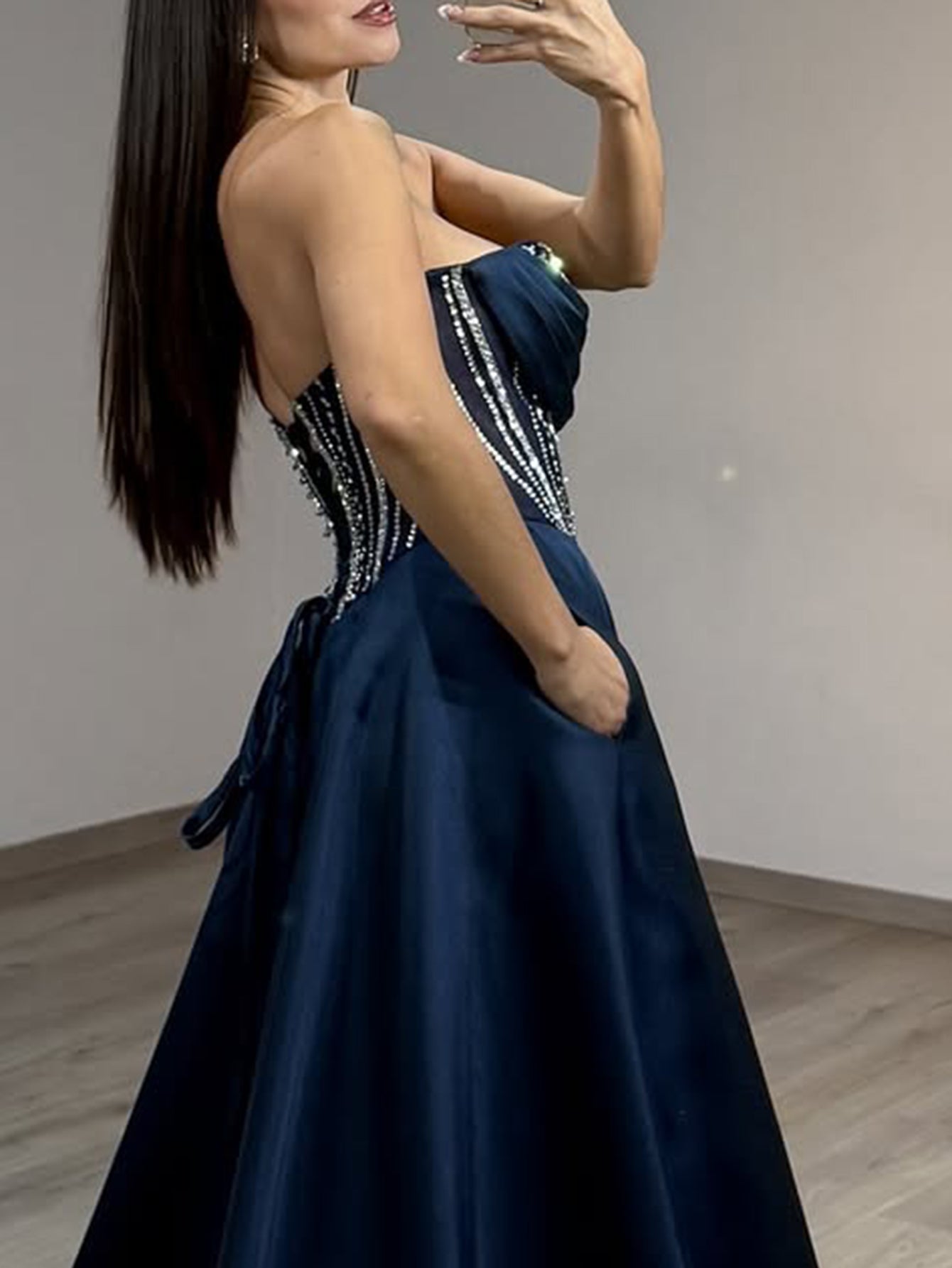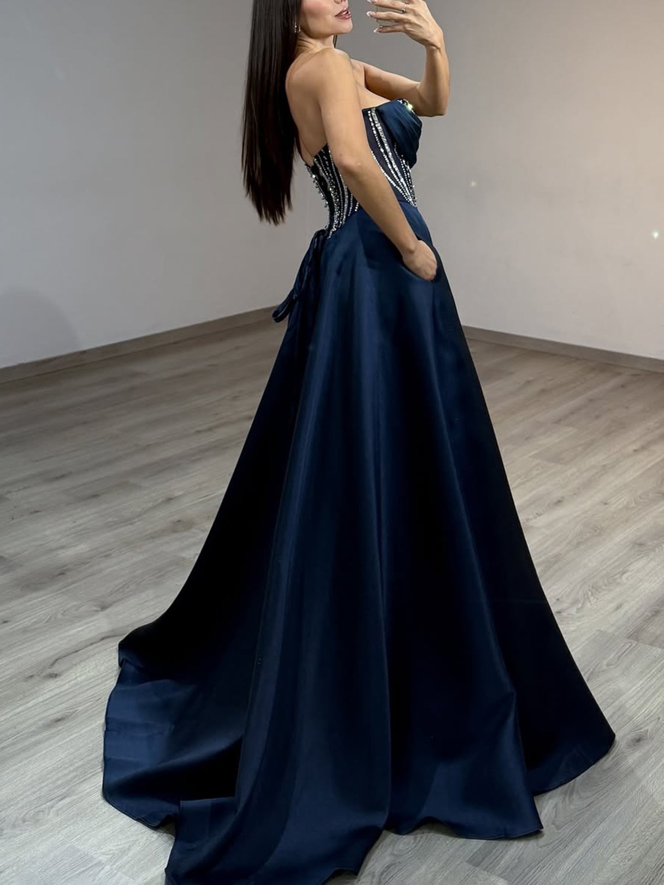Hot Fix Crystal Lace Up Ruched Bodice Long Ball Gown Prom Dress With Pocket - Dusty Blue