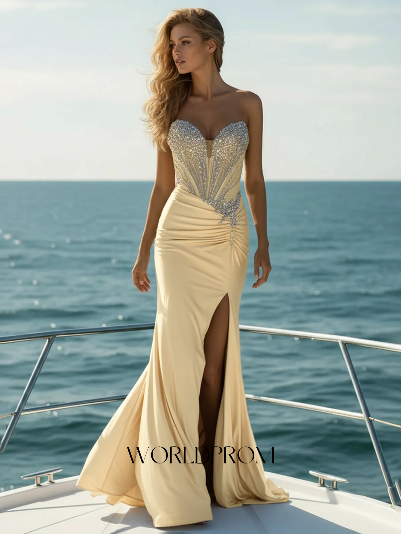 This satin prom gown features hot fix with crystal on the bodice. The strapless dress has a sweetheart neckline and split hem. Worldprom mermaid prom dresses are ideal for party, evening or festivals.