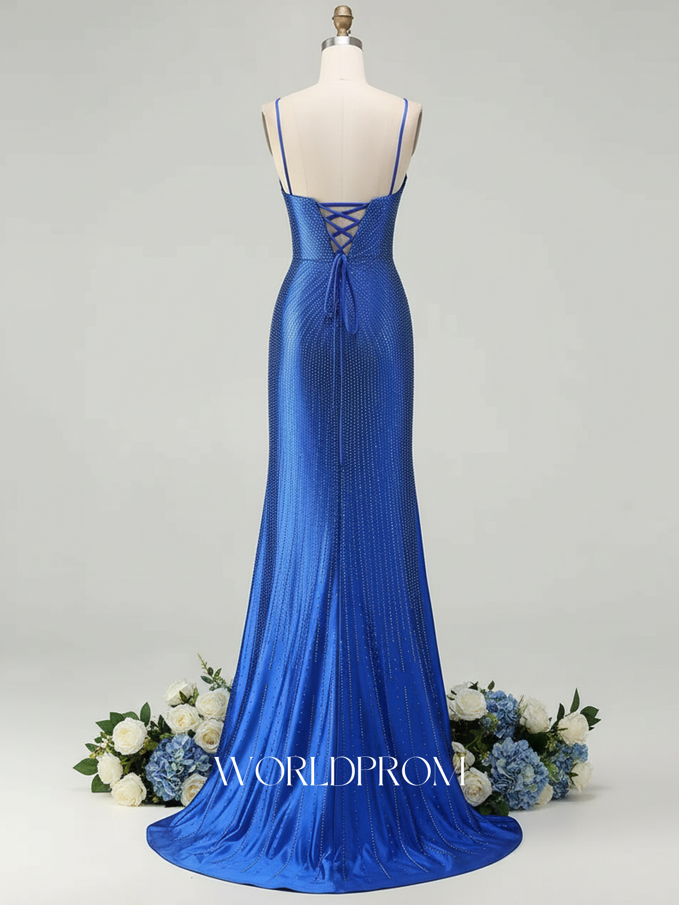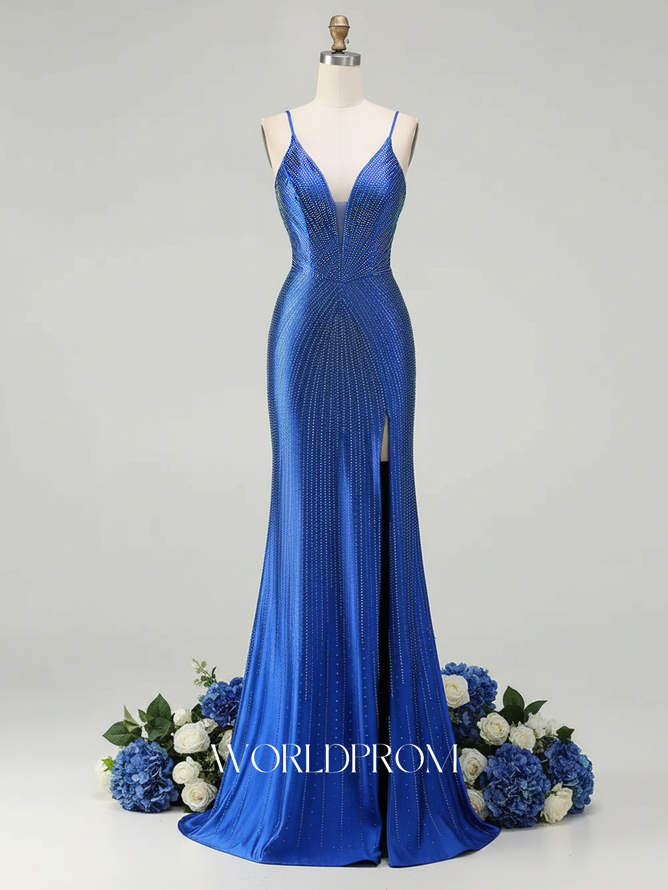 Hot Fix Crystal Spaghetti Shoulder Straps Mermaid Long Prom Dress With Slit - Royal Blue
