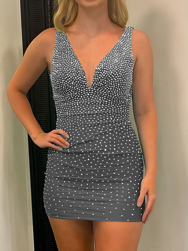 Hot Fix Deep V-Neck Sheath Mini Prom Dress - Grey