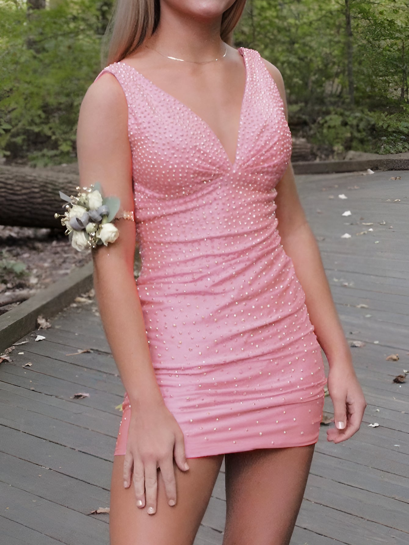 Hot Fix Deep V-Neck Sheath Mini Prom Dress - Pink