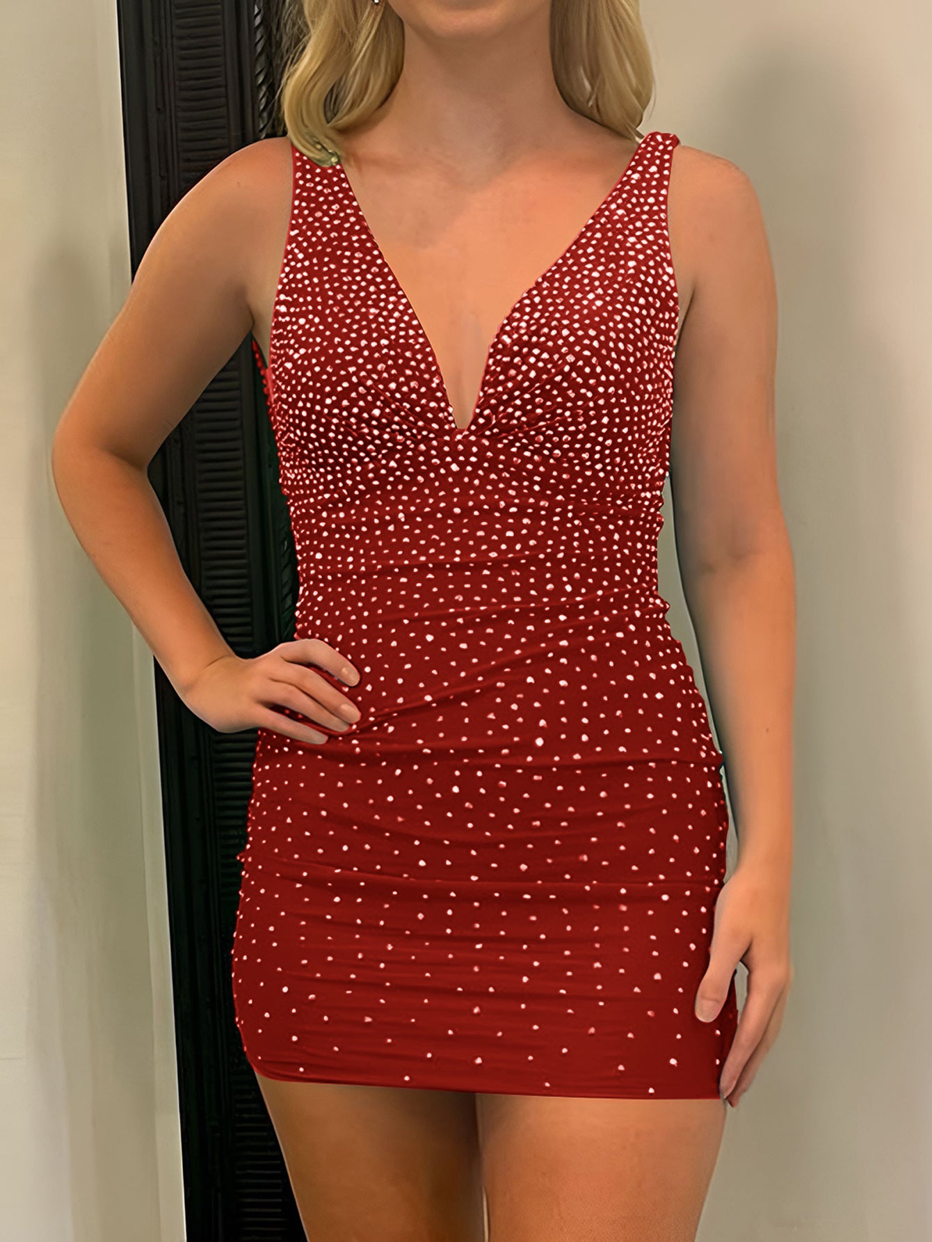 Hot Fix Deep V-Neck Sheath Mini Prom Dress - Red